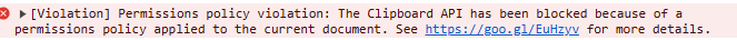 导致问题的原因是 iframe 的 CSP 安全机制,意味着浏览器阻止了你的代码访问剪贴板 API,原因是当前文档应用了限制该 API 使用的权限策略(Permissions Policy)。