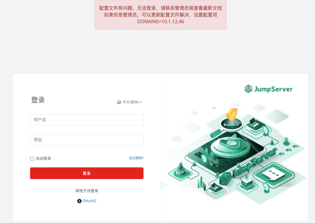 JumpServer v3.6以及以后的版本中引入了更严格的访问机制,强制要求配置 DOMAINS 可信任域名才能正常访问服务: