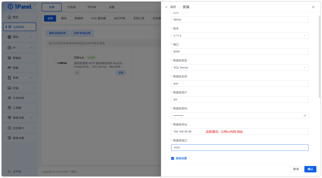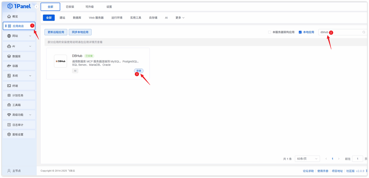 登录 1Panel,进入 应用商店,搜索 DBHub,点击安装。