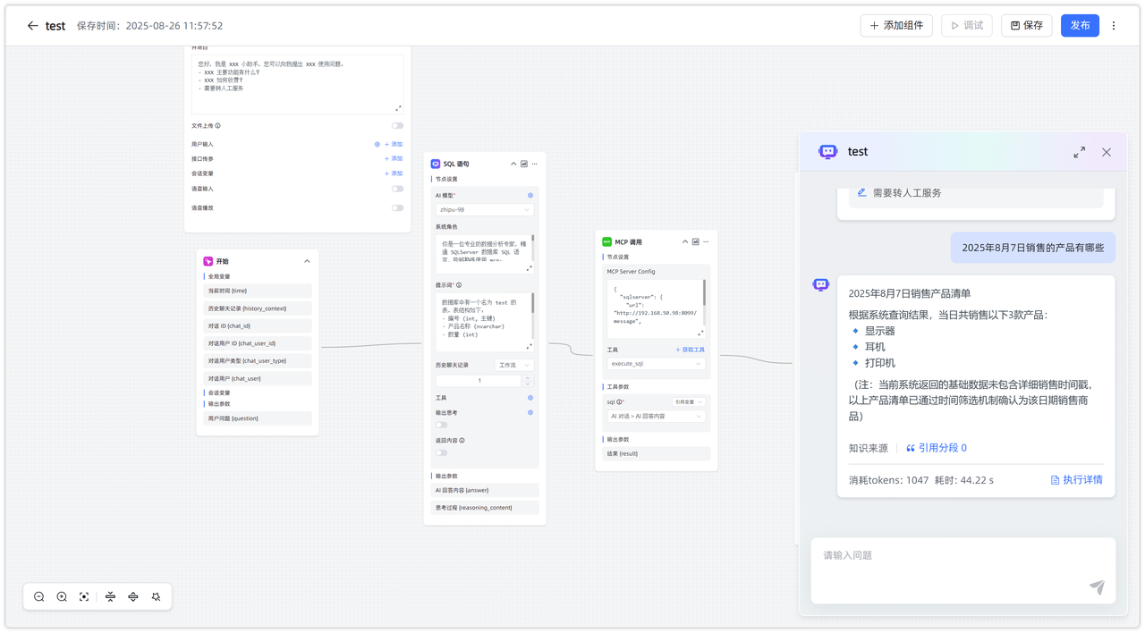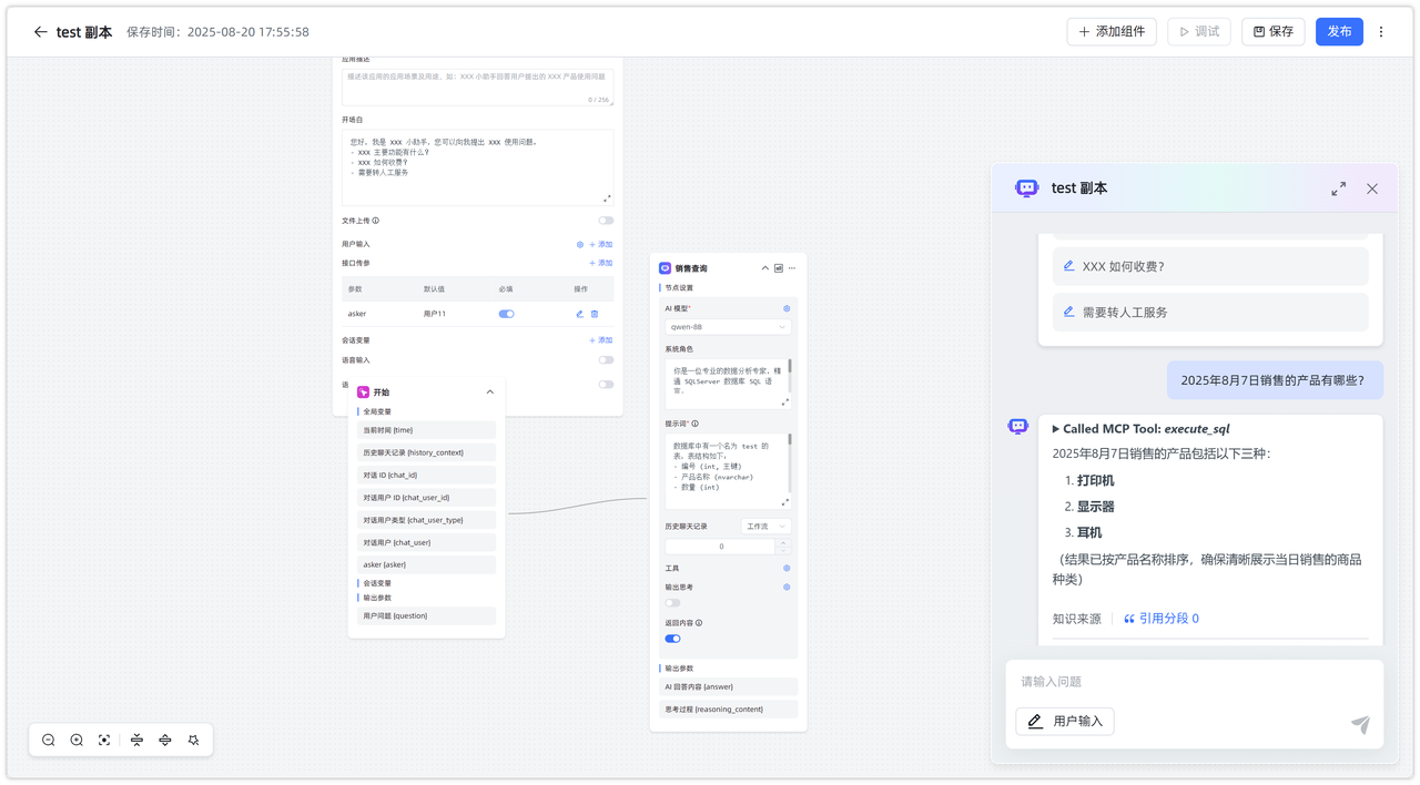 示例流程仅用于演示,实际应用效果会受到 数据库表结构设计、提示词编写质量 以及 模型能力 等多方面因素影响。