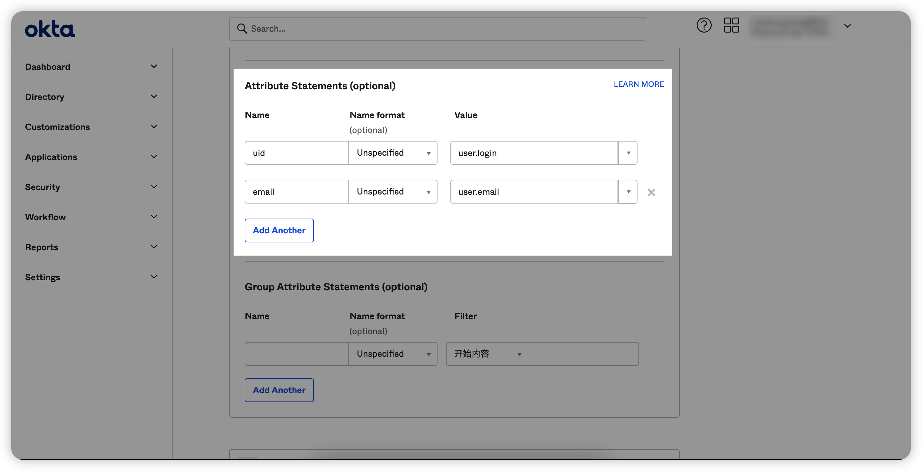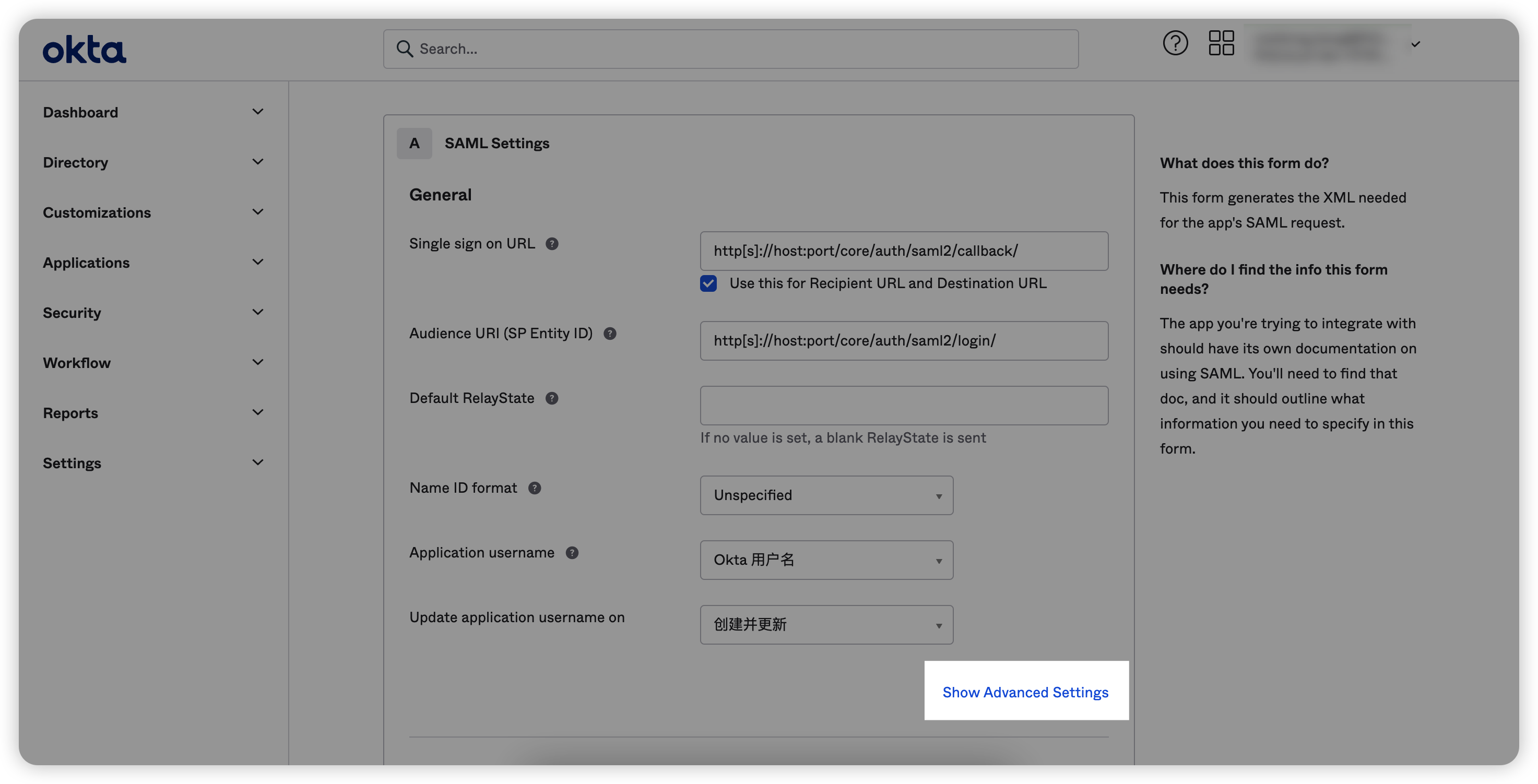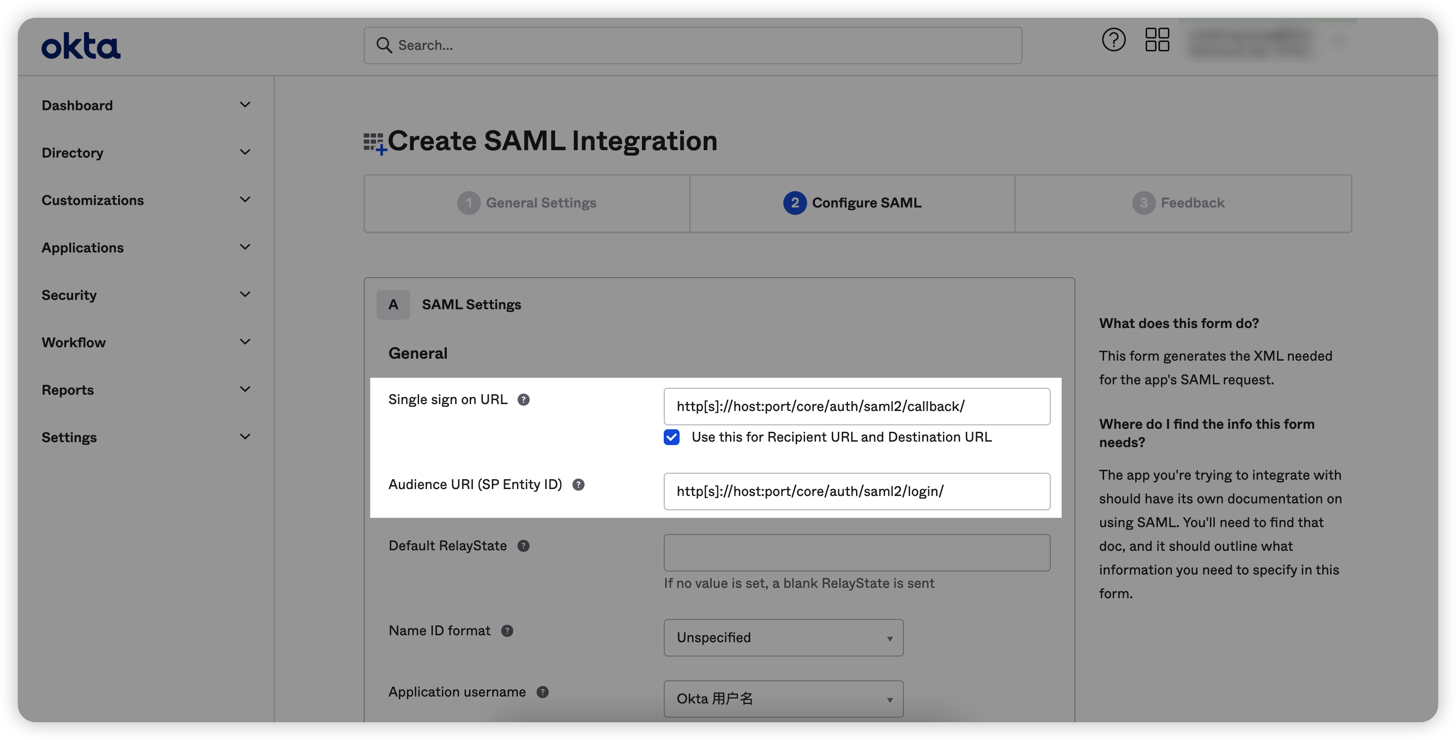 Single sign on URL(即Okta认证成功的回调地址):http[s]://host:port/core/auth/saml2/callback/;