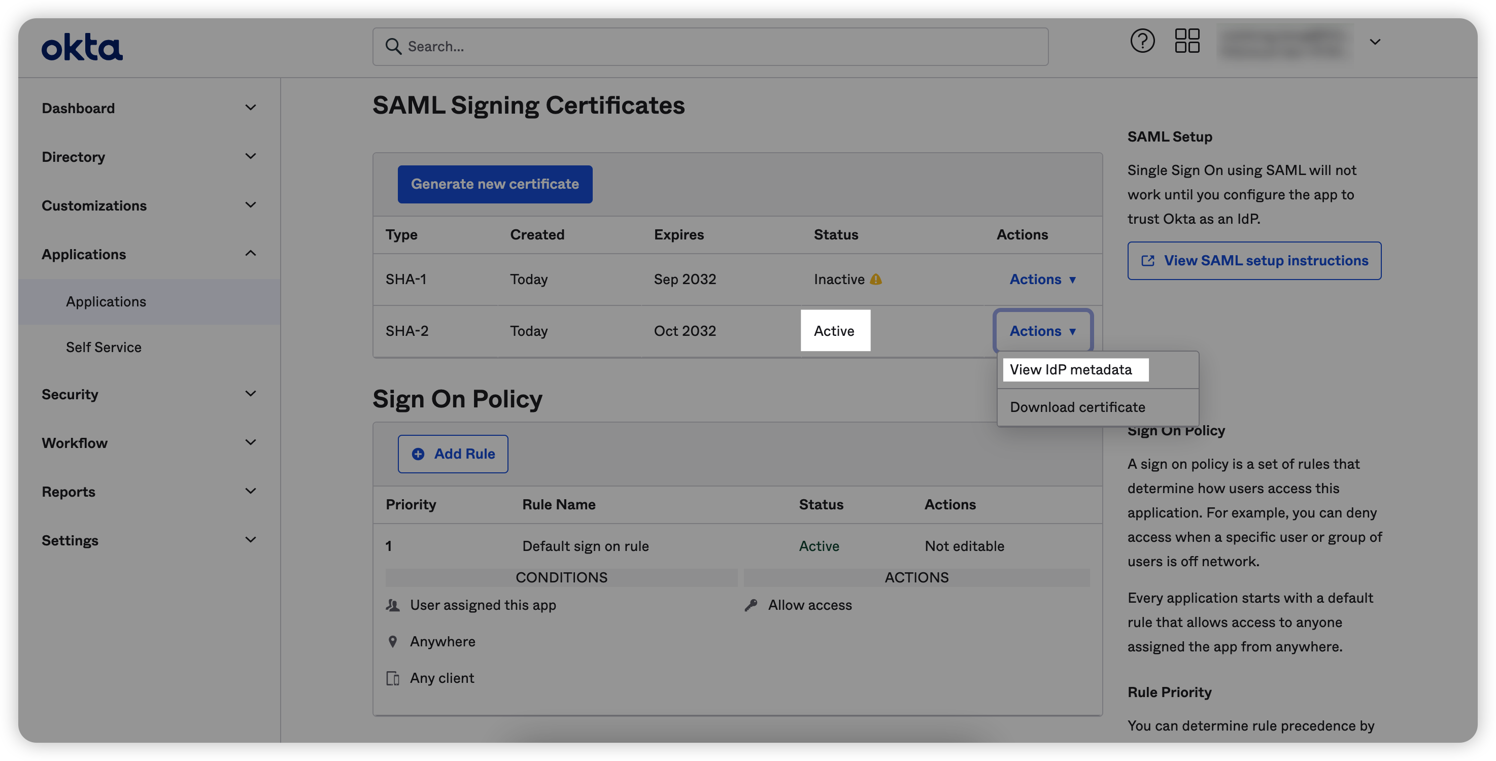 9. 创建应用成功后,在应用界面找到SAML Signing Certificates,选择状态为 Active 的记录,在“Action”菜单中点击“View IdP metadata”选项;