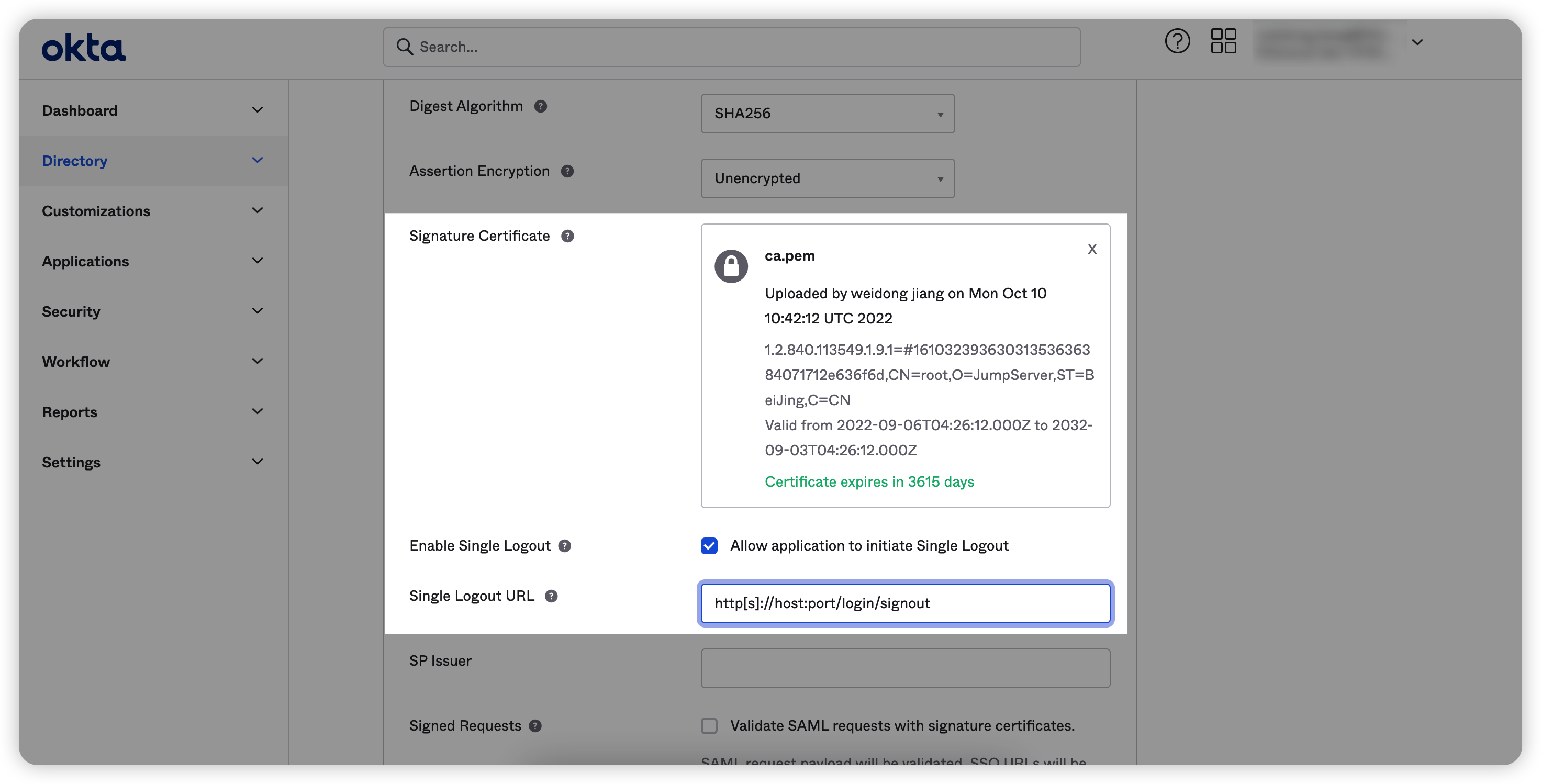 $ openssl req -new -x509 -days 3650 -key server.key -out server.crt -subj "/C=CN/ST=mykey/L=mykey/O=mykey/OU=mykey/CN=domain1/CN=domain2/CN=domain3" # 这个是证书填写Single Logout URL(即Okta注销地址),一般为:http[s]://host:port/login/signout;