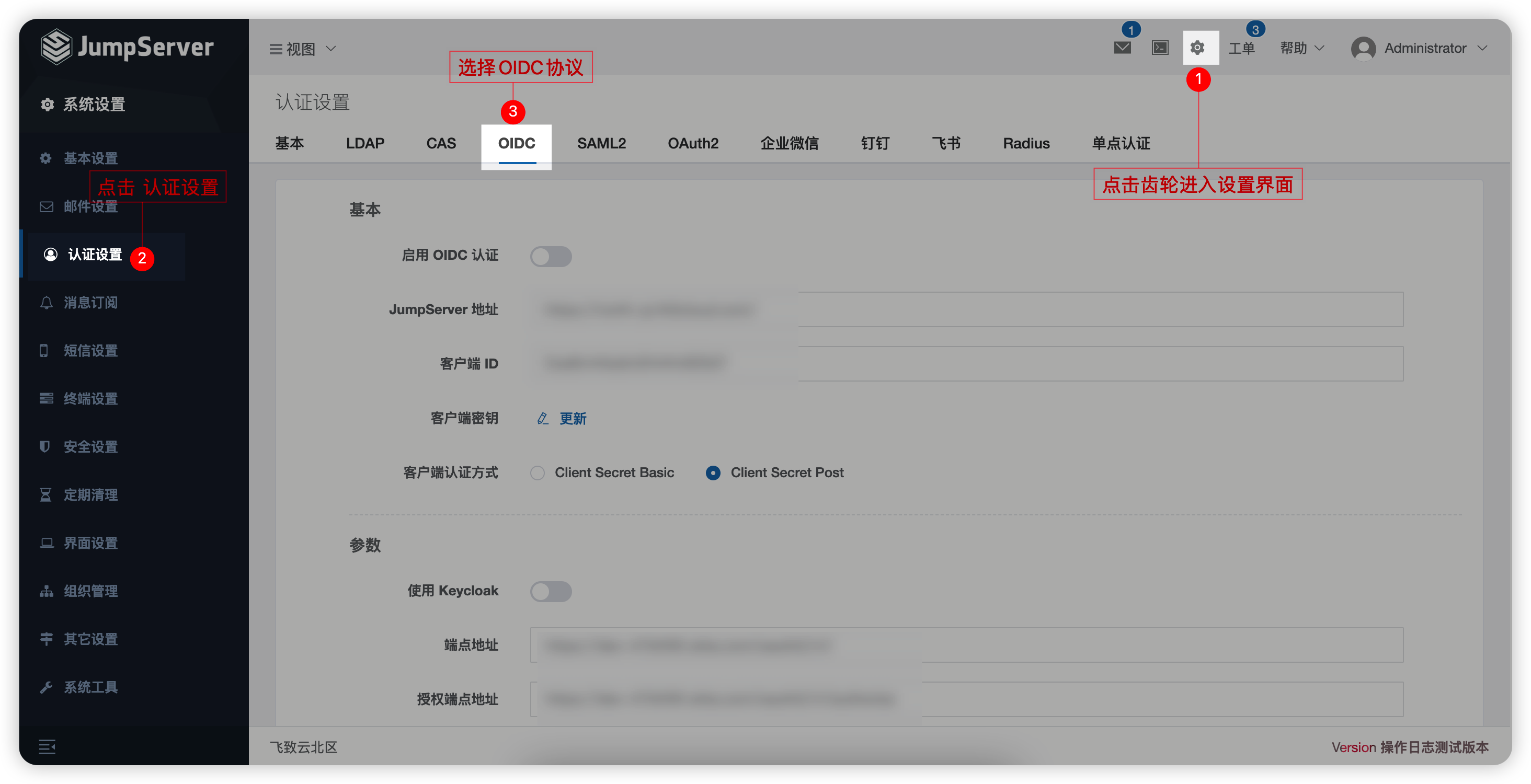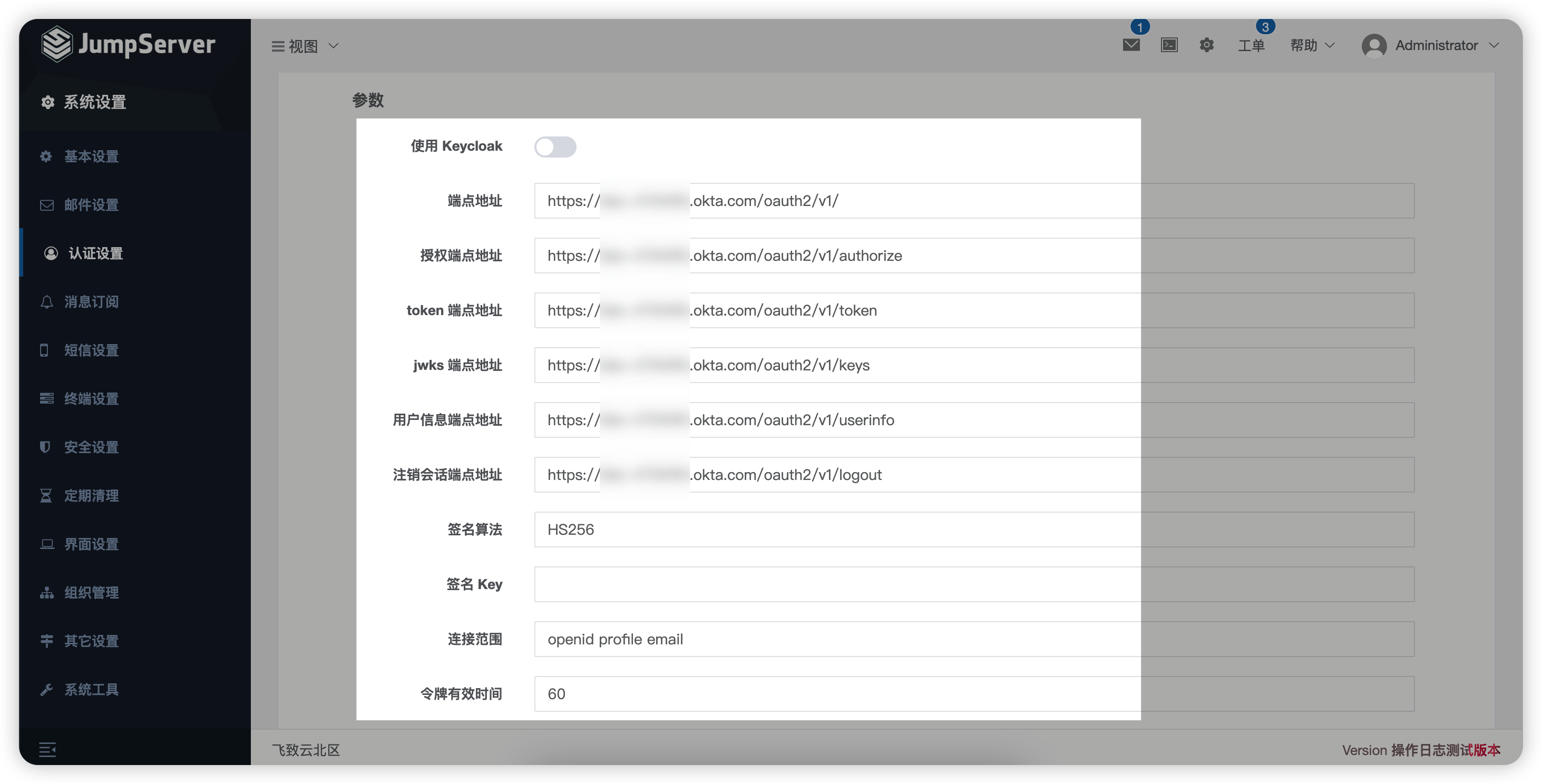 - 登录JumpServer后,选择“设置”→“认证设置”→“OIDC”,并根据下图填入相应参数,域名处更换为自己的Okta域名;