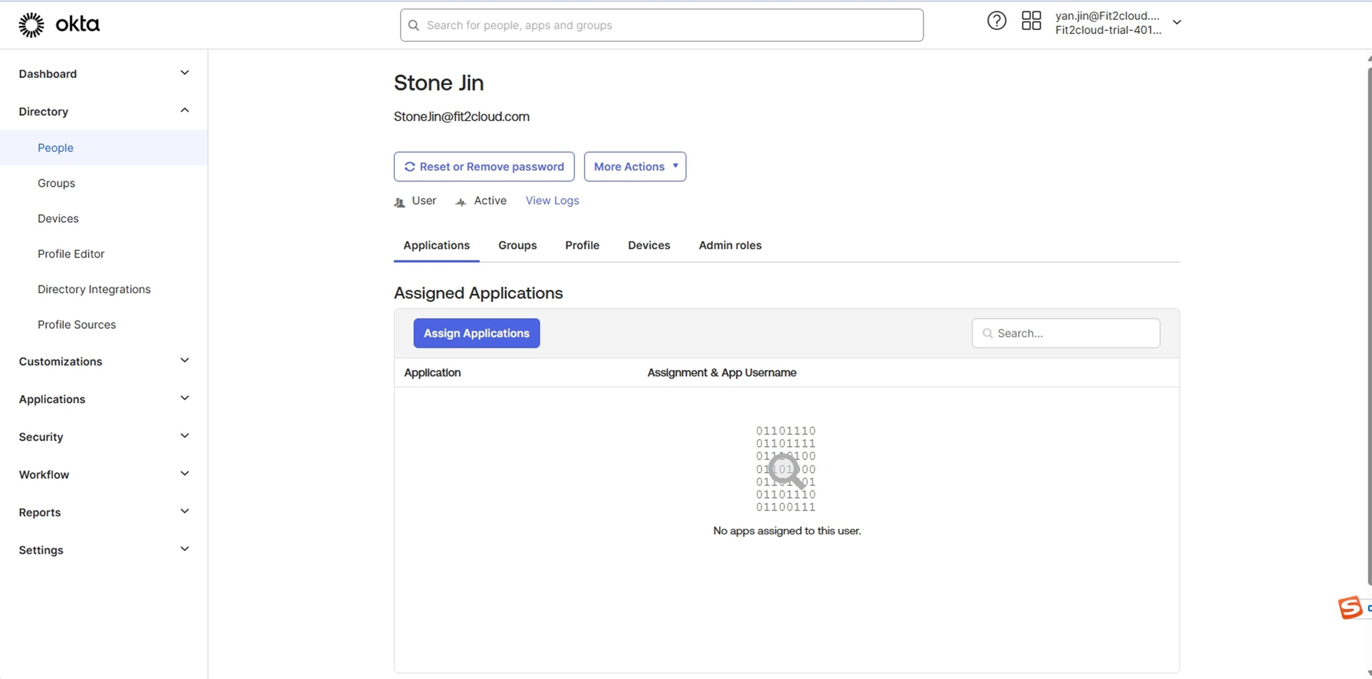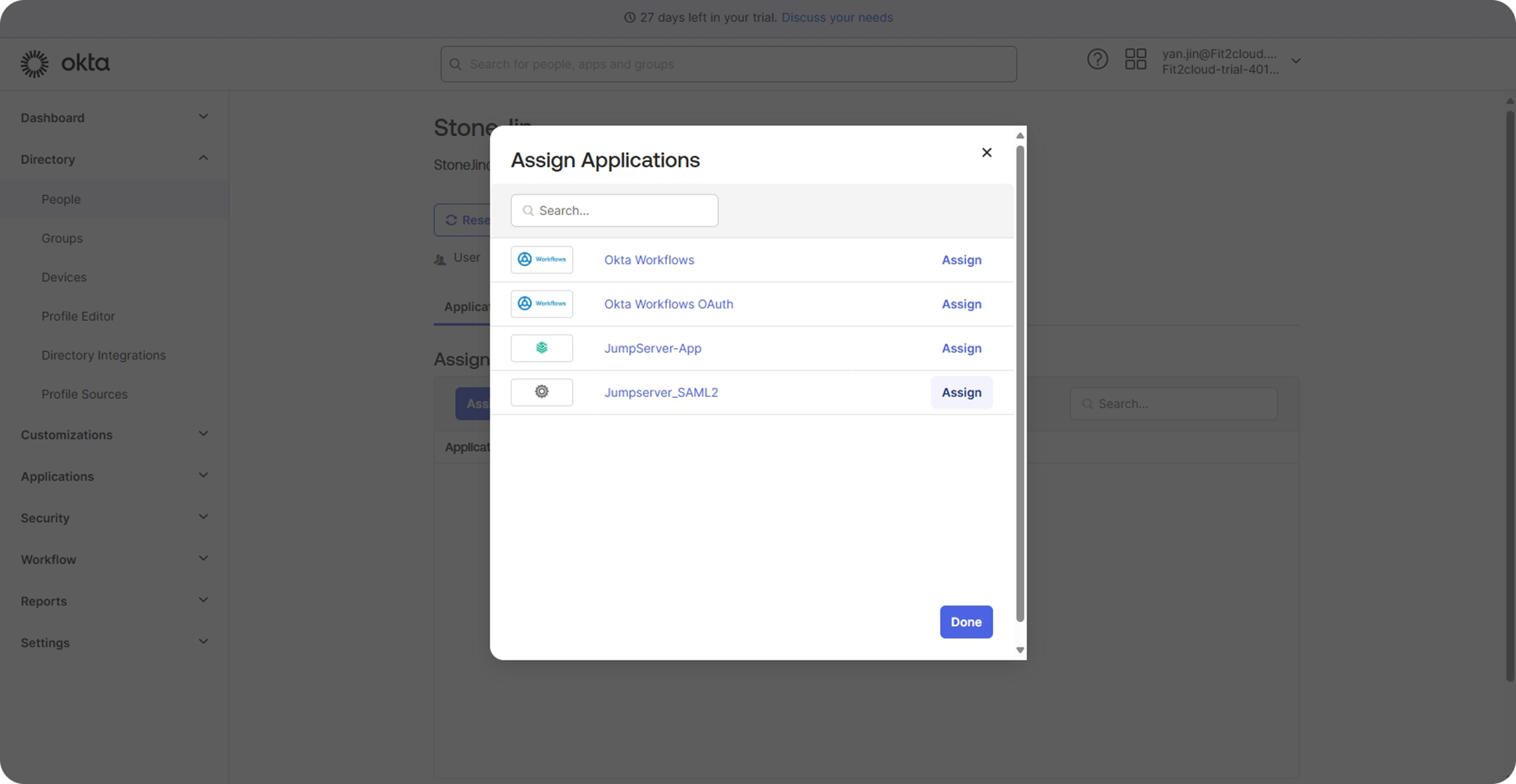 - 登录 Okta,选择“Directory”→“People”→“Add person”;
