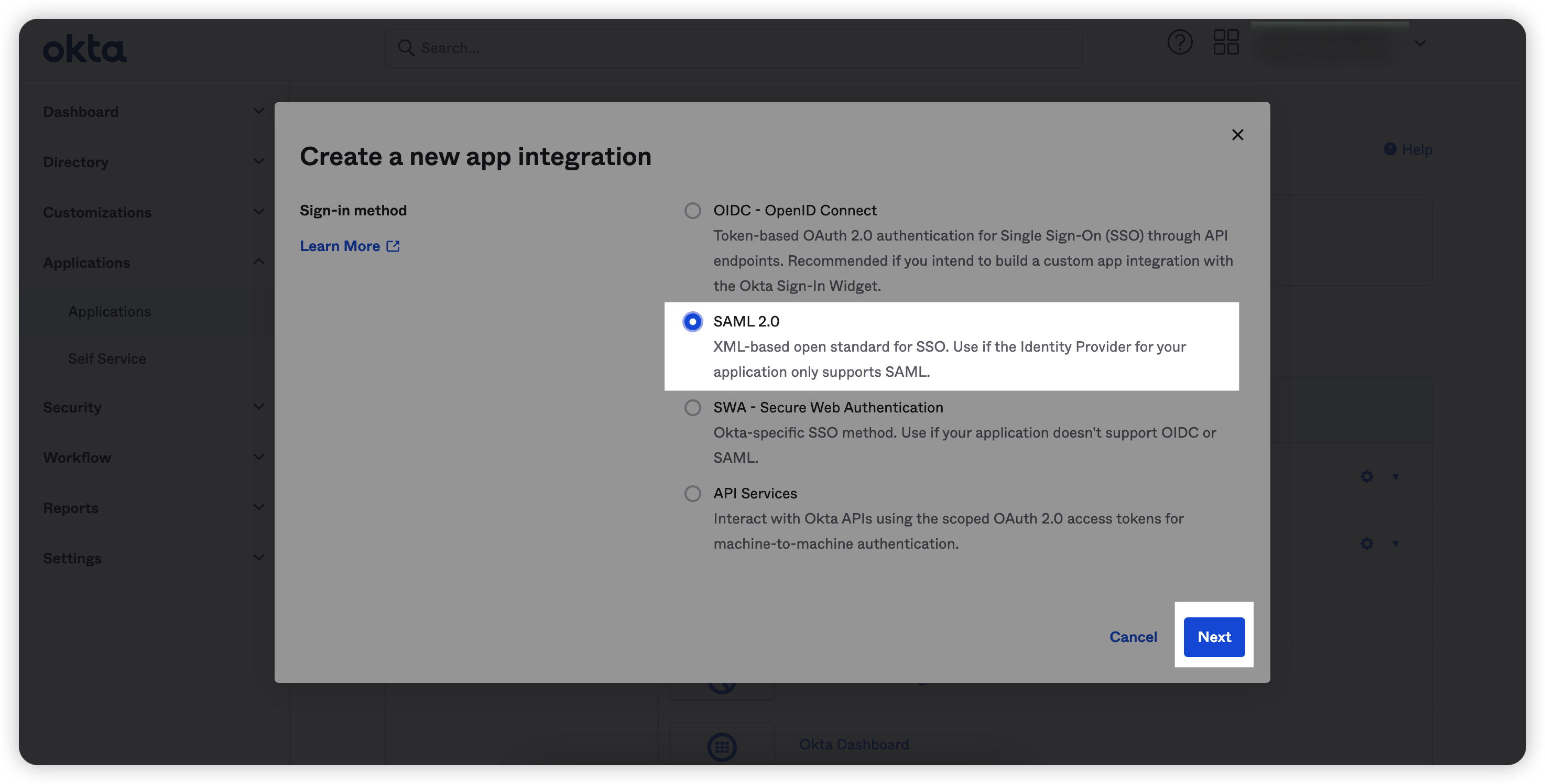 3. 选择“SAML 2.0”选项后,点击“Next”按钮;