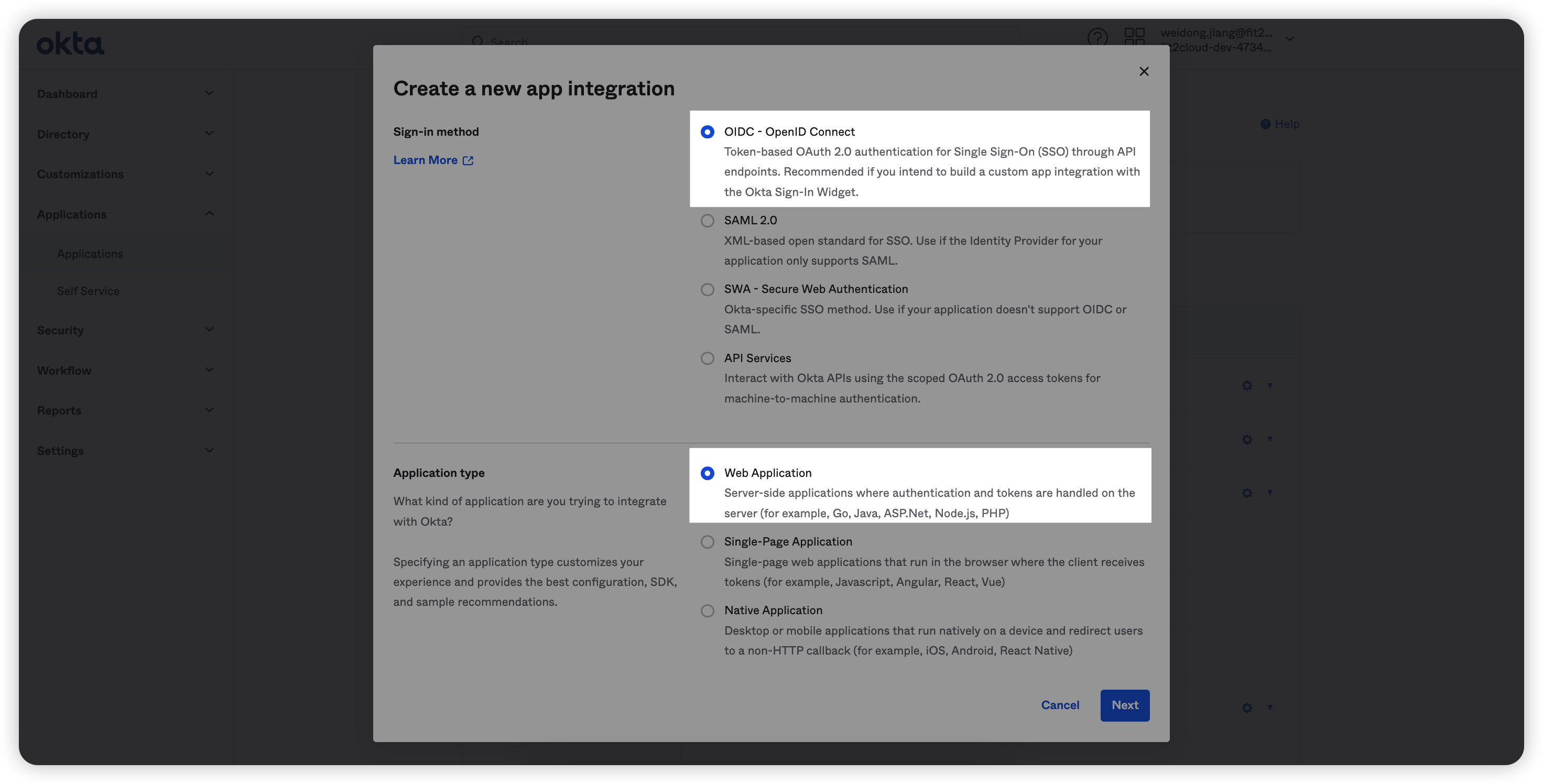 3. 选择“OIDC-OpenID Connect”选项,然后选择“Web Application”选项,点击“Next”按钮;