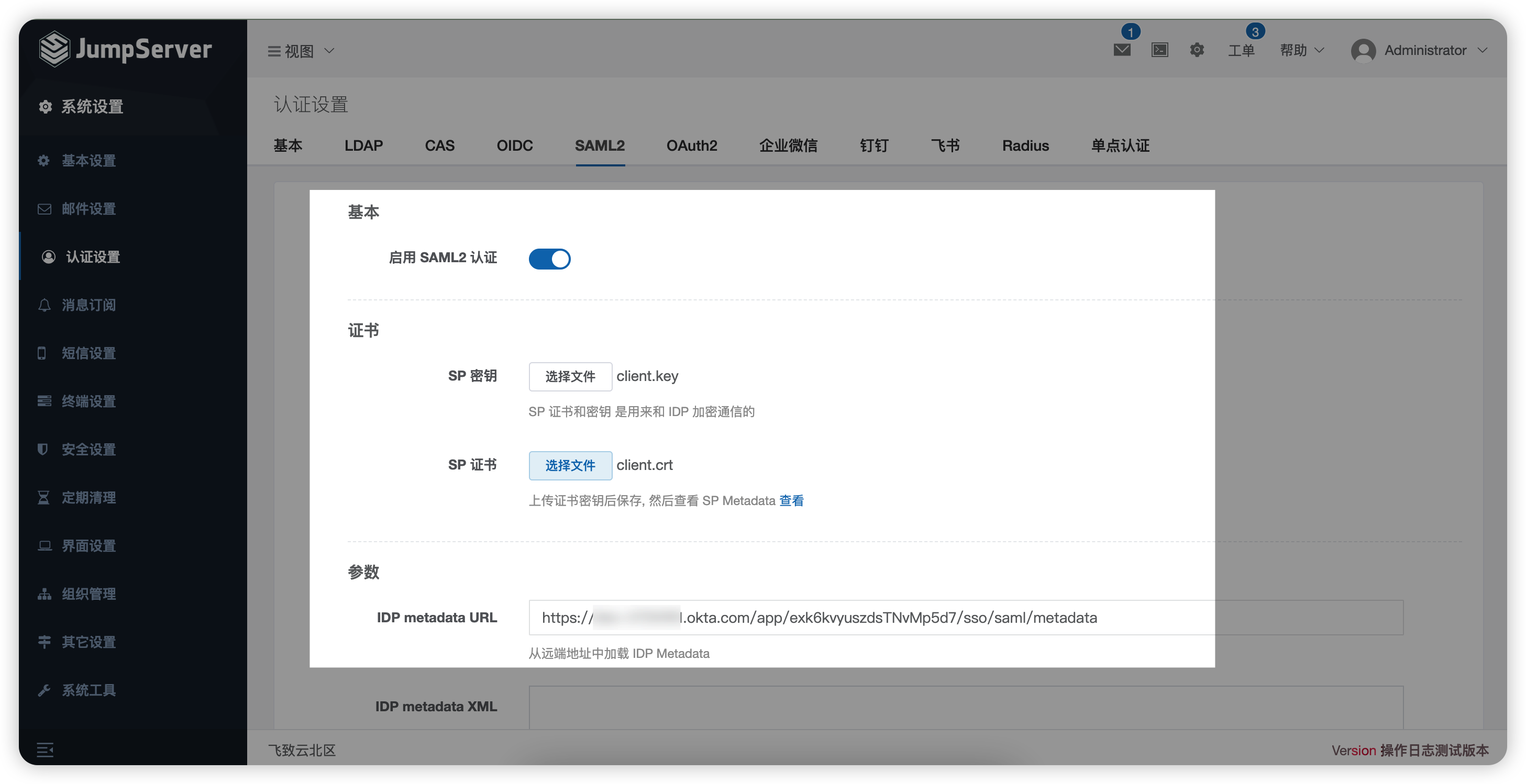 并把第10步生成的URL地址,填写在“IDP metadata URL”中,即可完成JumpServer端的配置。
