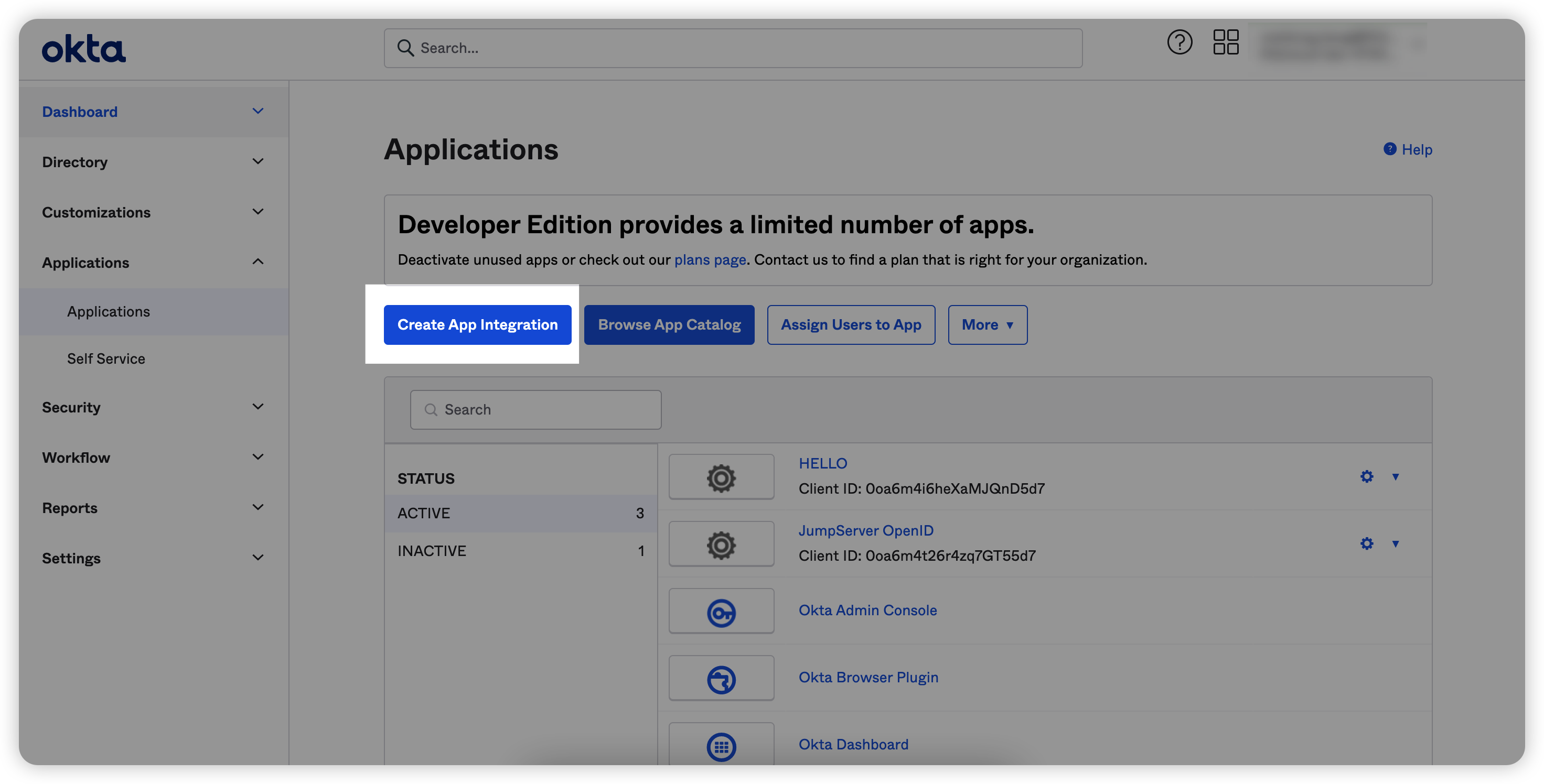 - 通过官网进入到Okta平台首页后,点击左边菜单栏中的“Applications”→“Applications”;