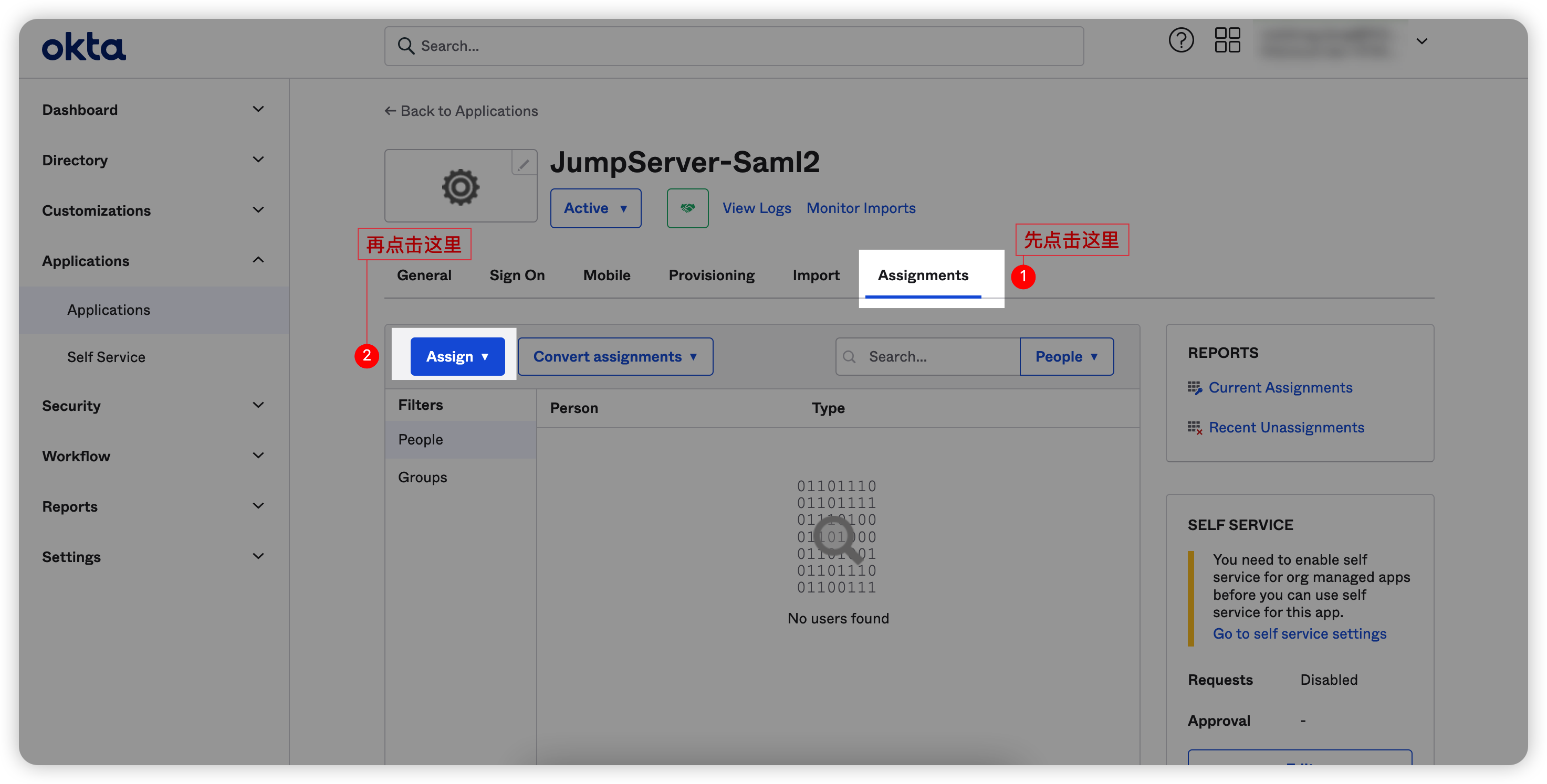 11. 点击应用名称,进入应用设置中找到“Assignments”选项就,点击“Assign”菜单邀请用户进入当前应用。“”“”
