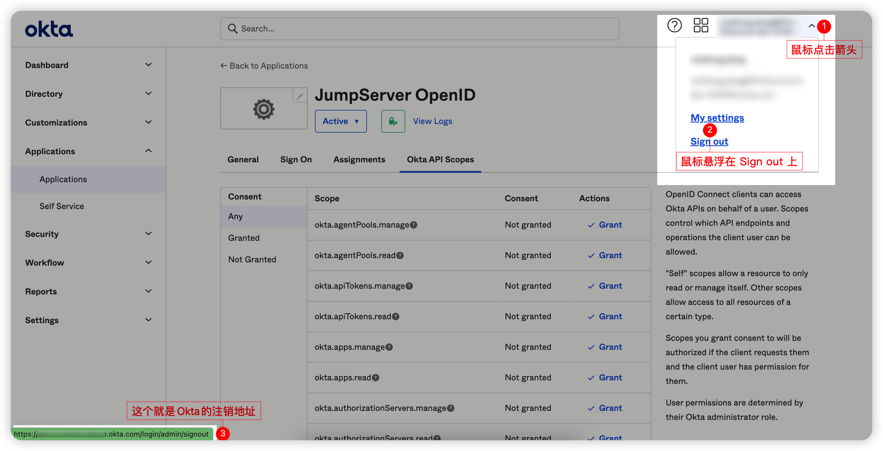5. 跳转到应用信息详情页后,进入“Okta API Scopes”选项卡进行授权;