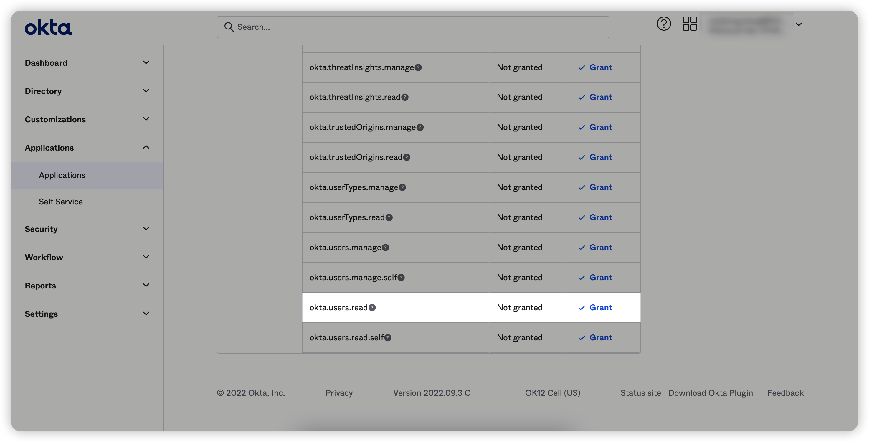 6. 在页面最底部找到okta.users.read,点击右侧“Grant”按钮完成授权动作,即可完成Okta端的对接设置。