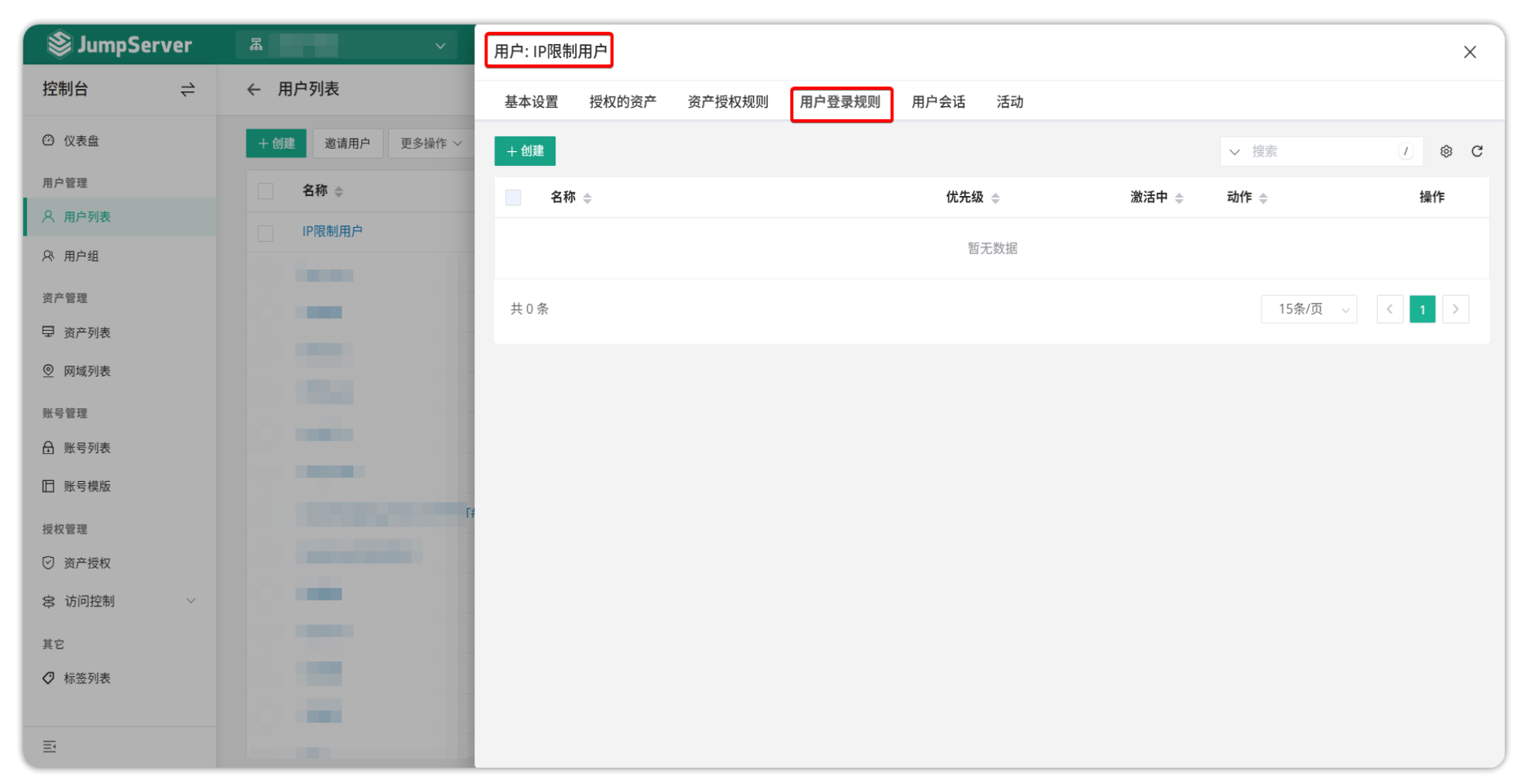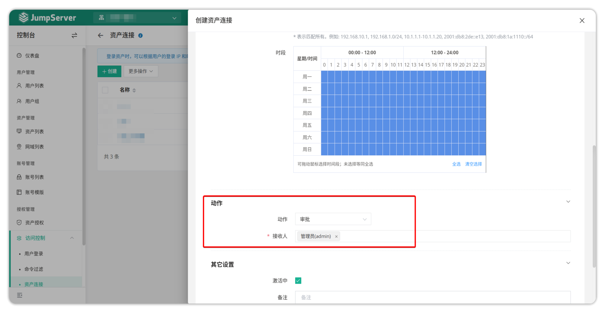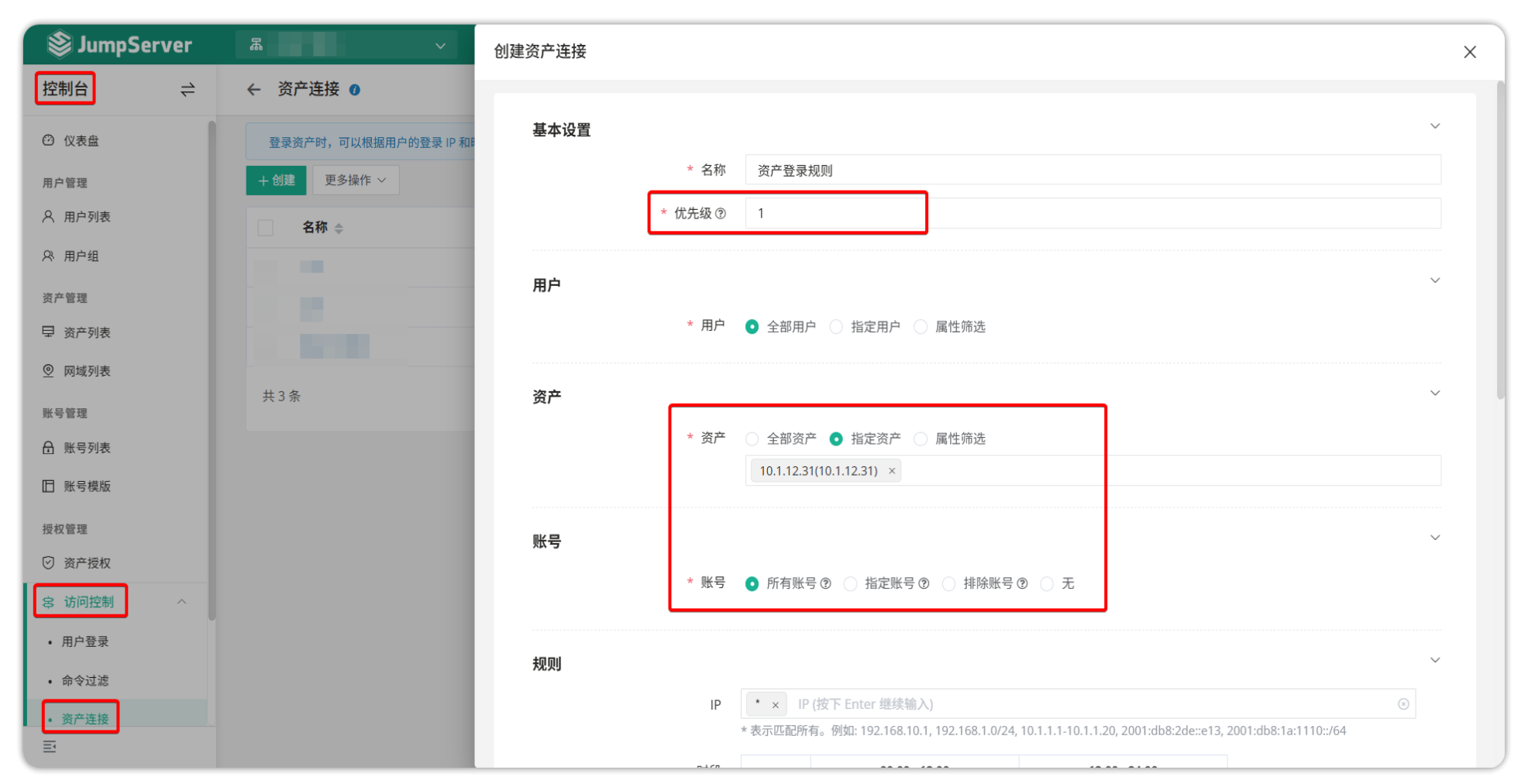 在 “控制台”→“授权管理”→“访问控制‘→”资产连接“→”创建“ 创建资产连接规则,包括 IP 限定,优先级,审批等。