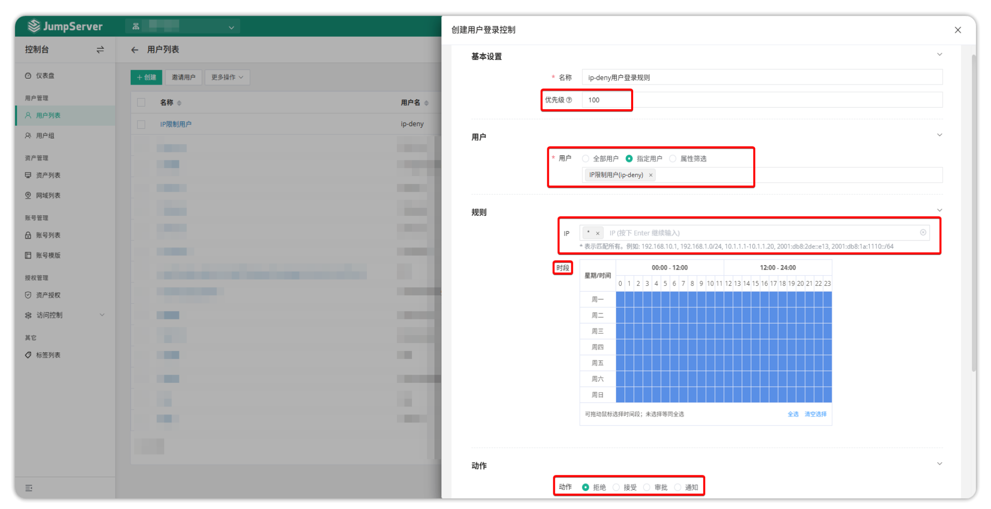 创建黑名单,即该用户使用所有的 IP 在所有时间登录都拒绝,优先级为 100。