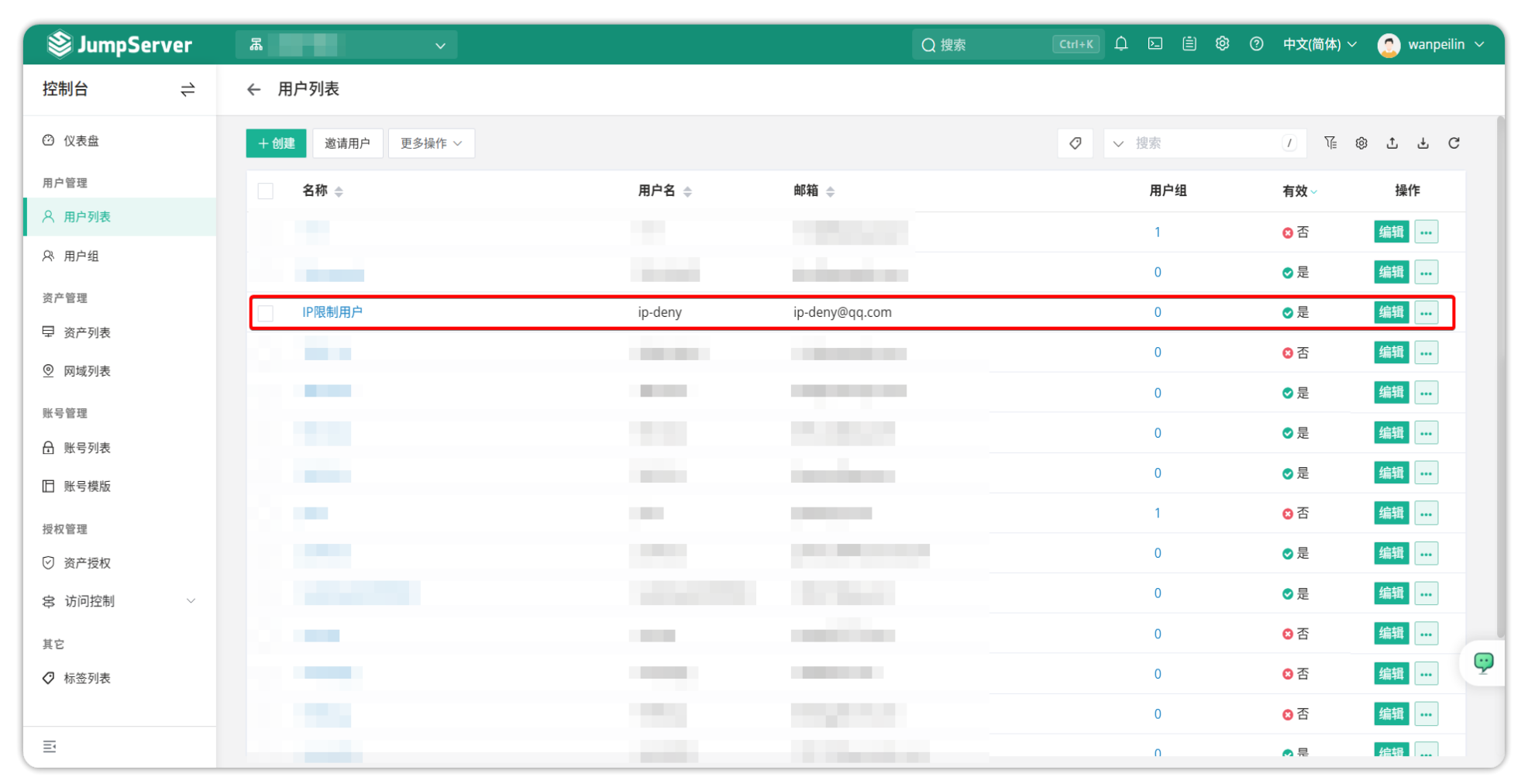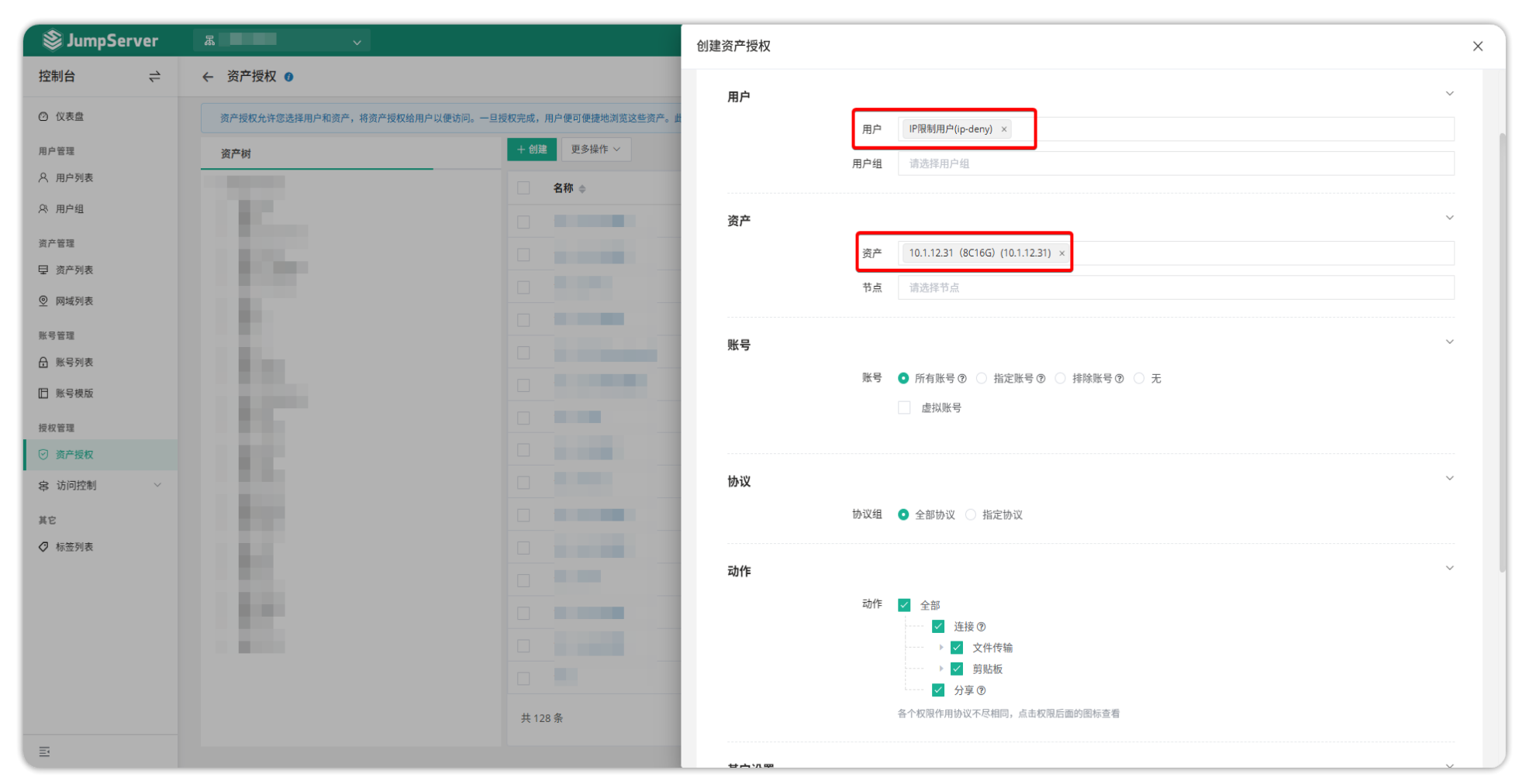 创建用户授权,仅允许 ip-deny 用户登录需要被限制的资产。