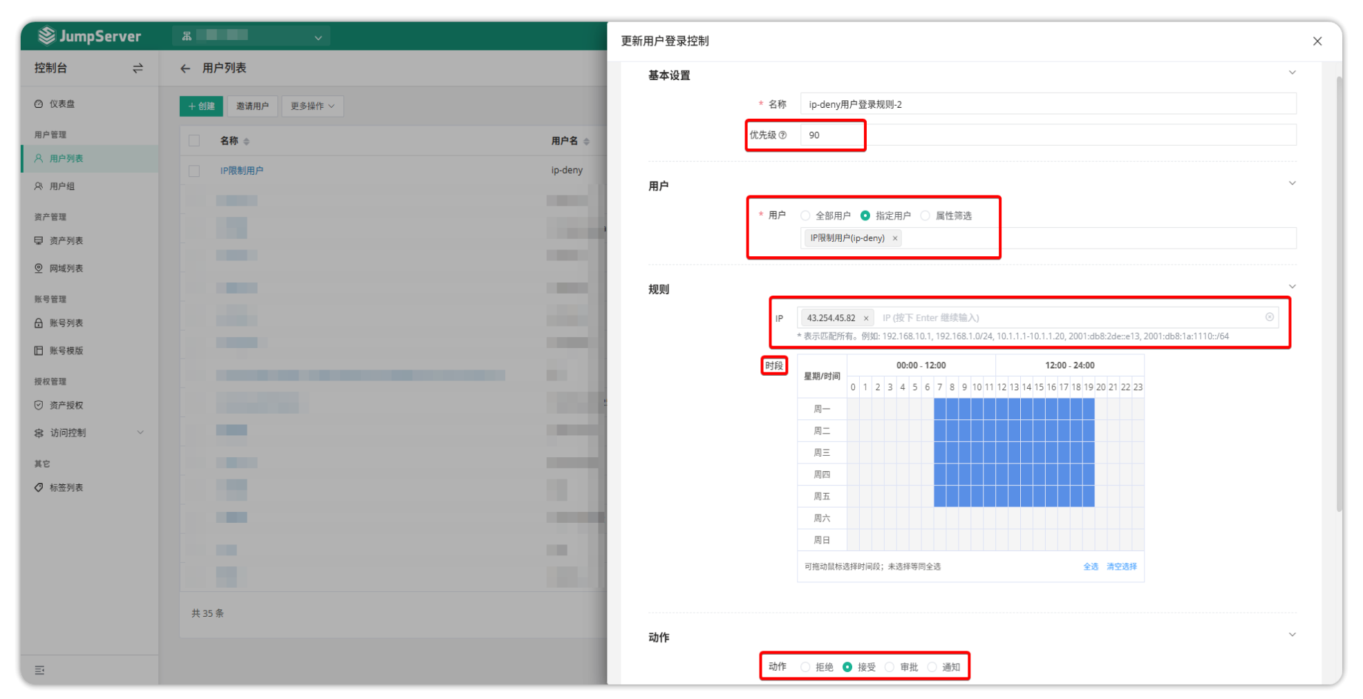 创建白名单,即该用户使用指定的 IP 在所有时间登录允许,优先级为 90;