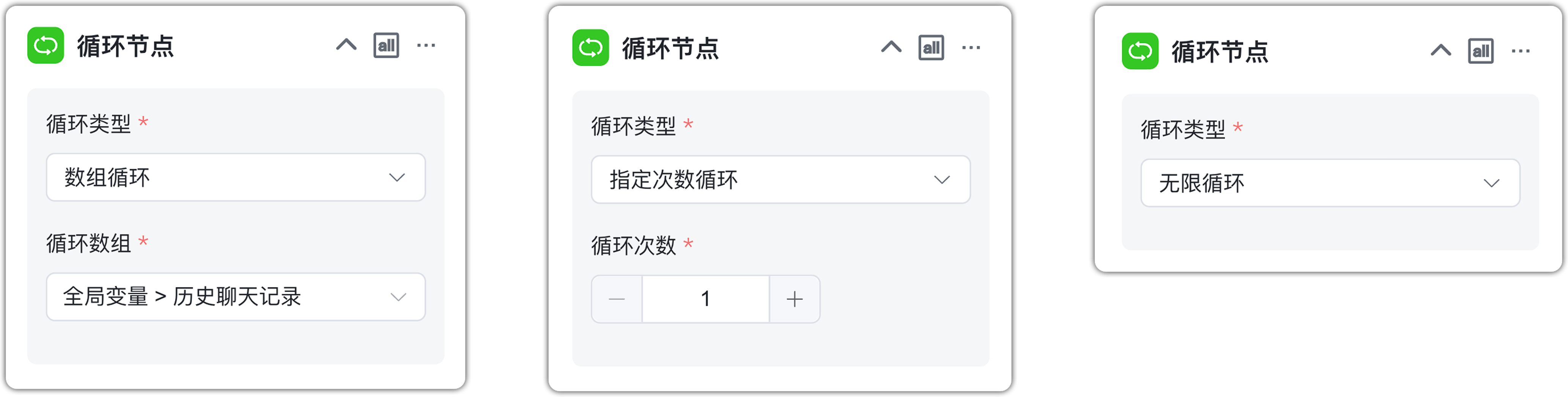循环类型是循环节点的运行模式。目前支持以下三种类型:
