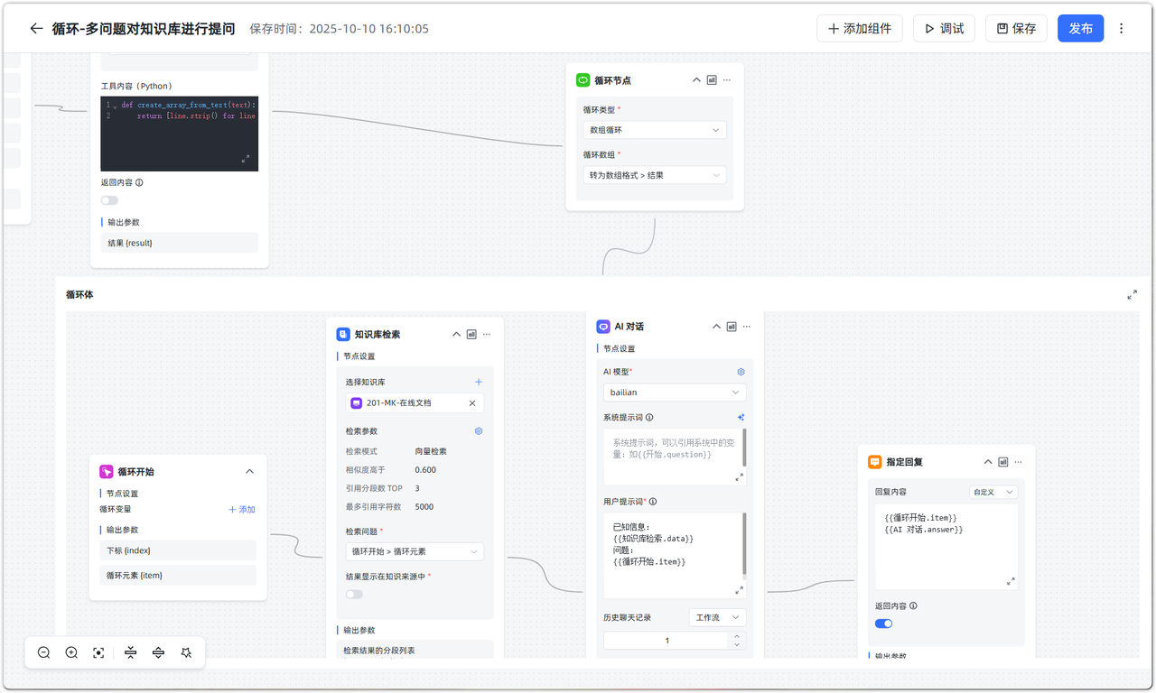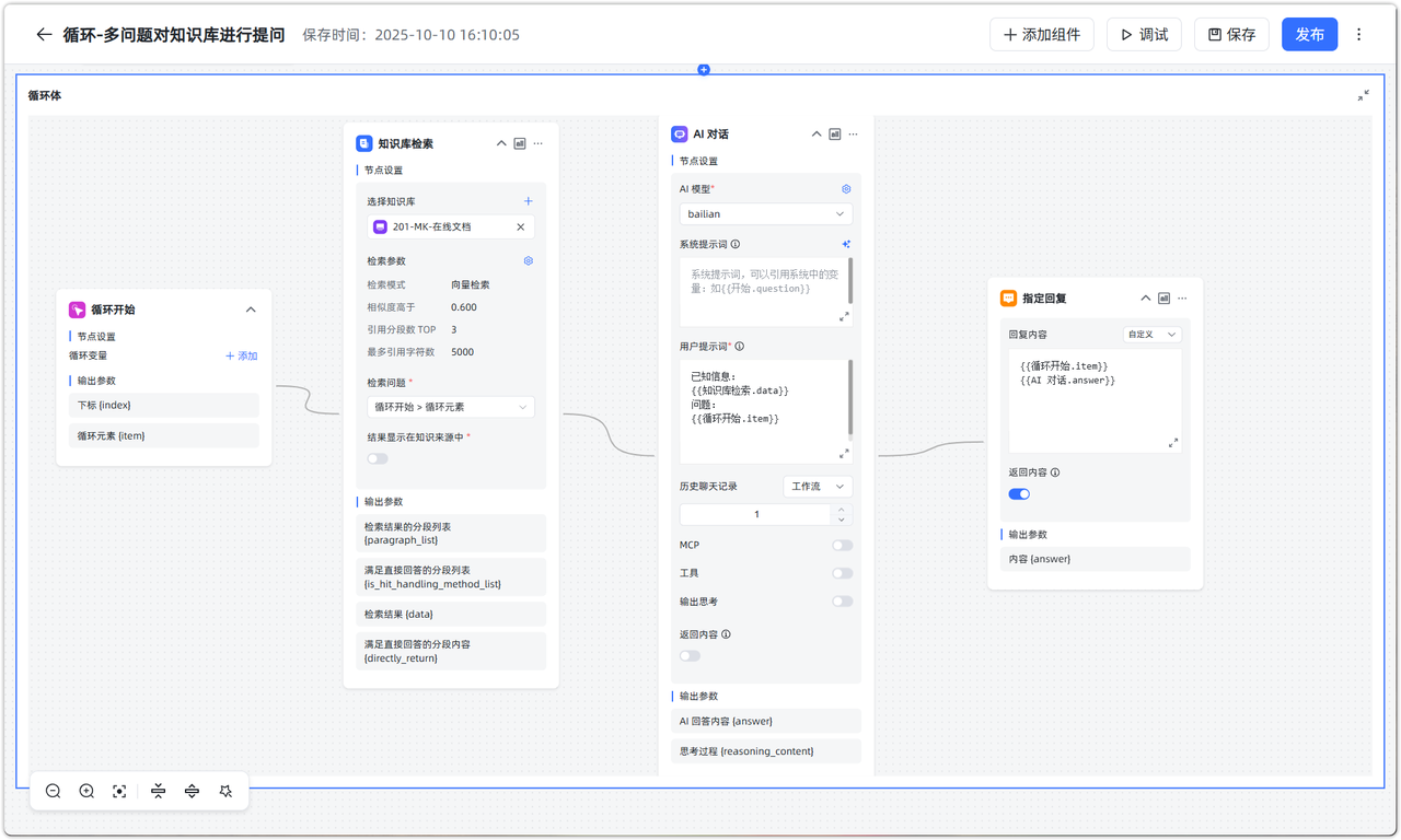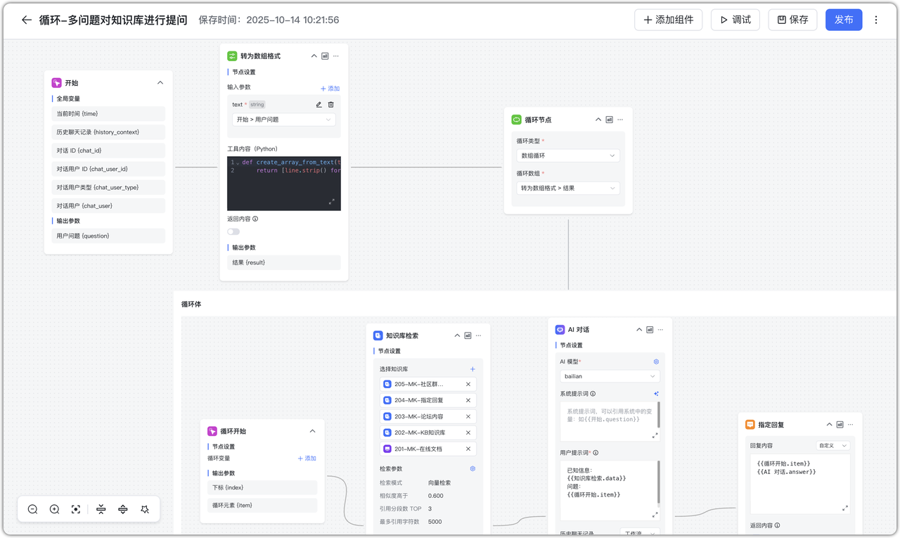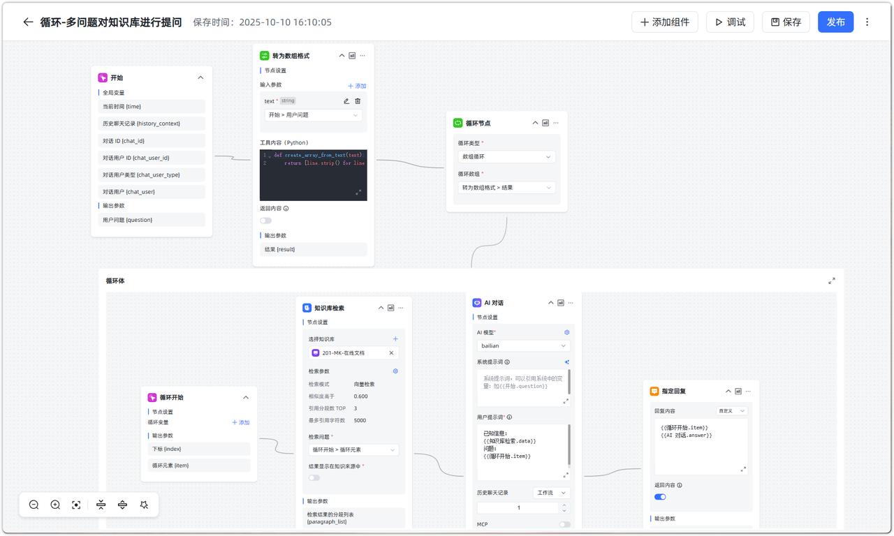 应用场景:在知识库问答中,多个问题同时提问可能导致检索精度降低或超过模型最大 Tokens。通过数组循环,可以将多个问题分次提问,提高准确度与效率。