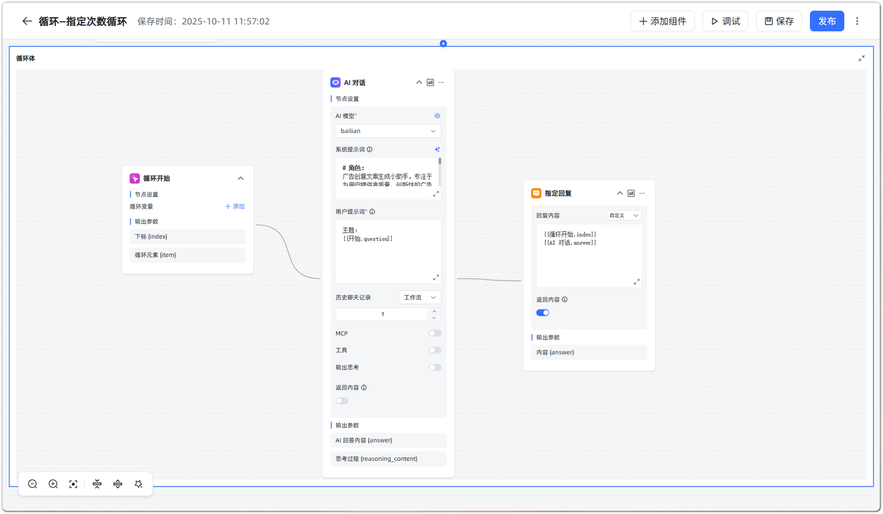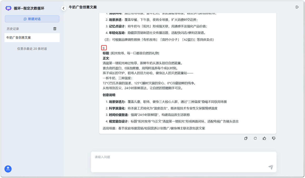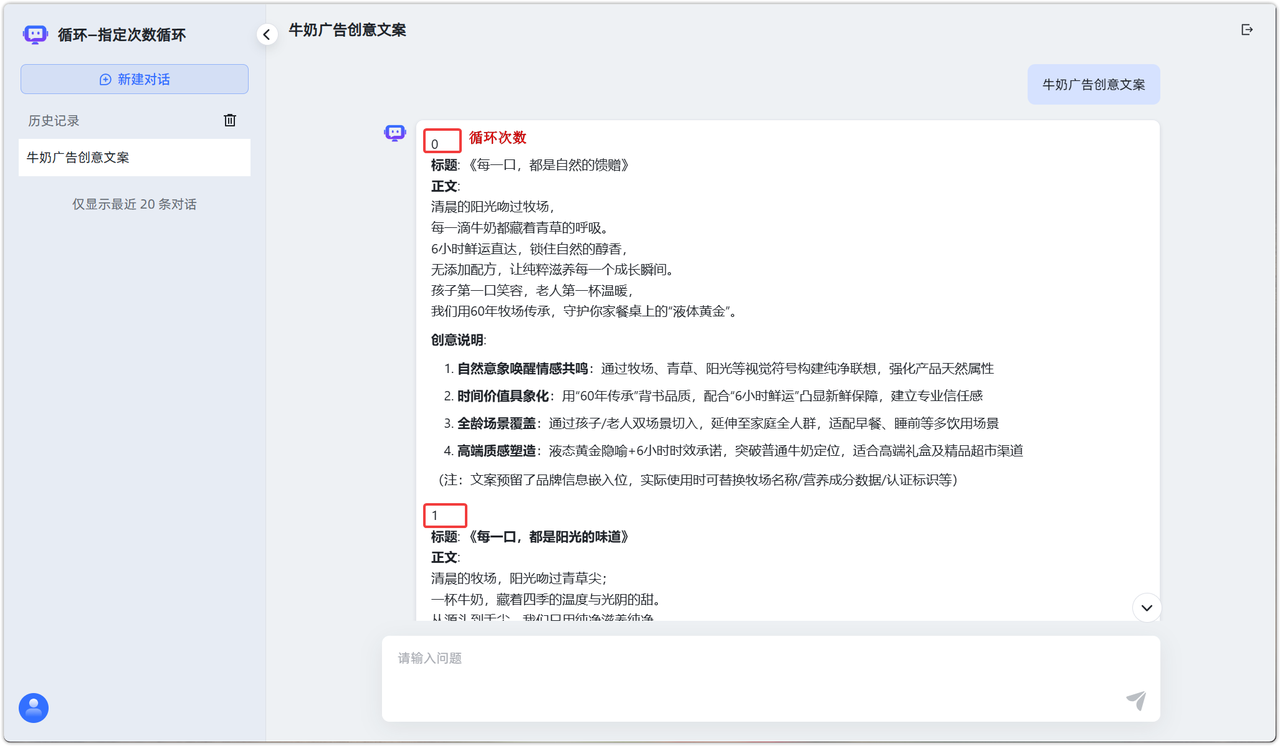 应用场景:用户希望快速生成多条广告创意文案,适合通过指定次数循环完成重复生成任务。