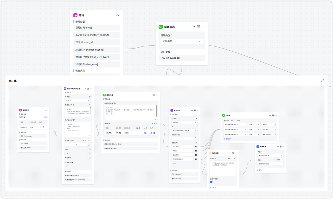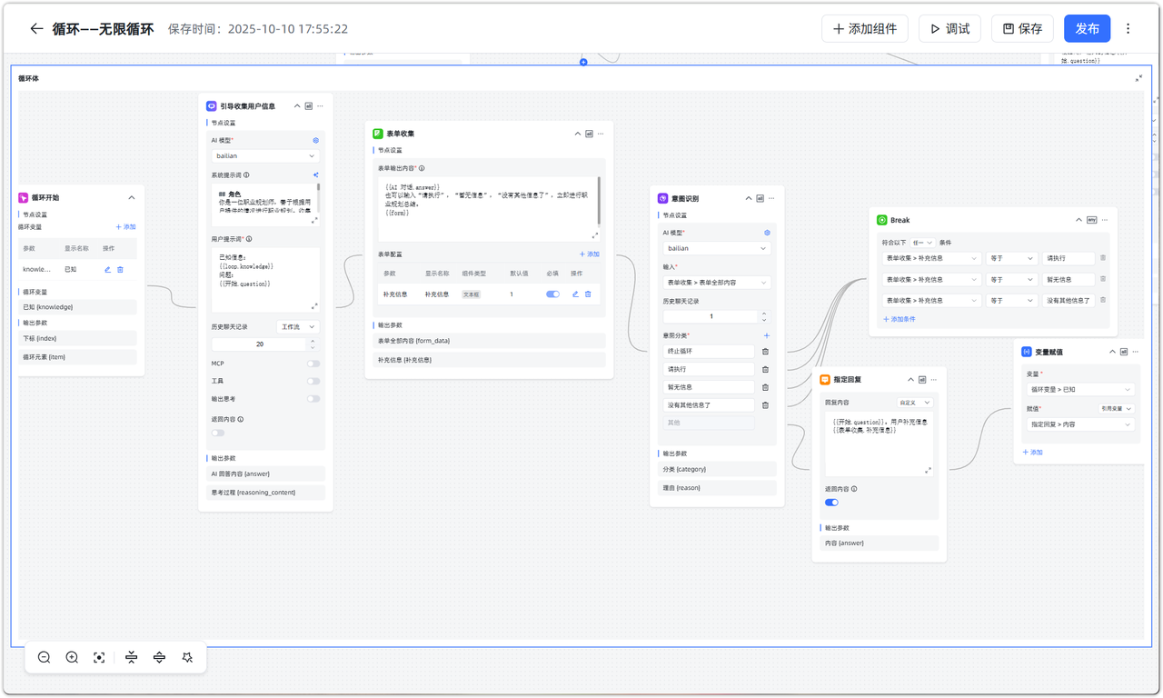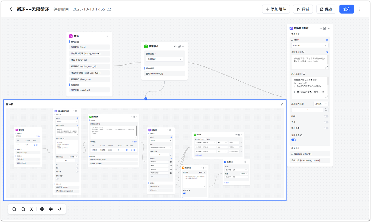 循环体是实现这个职业规划信息补充的重要部分,需要由 AI 对话引导用户补充信息在表单中,再经过意图识别进行判断是否跳出循环体。