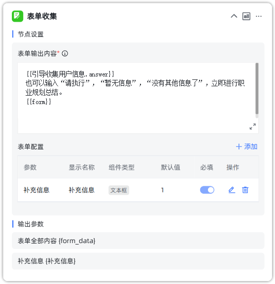 设置表单输出的内容为 AI 对话输出的结果,加上相应的提示语,并给出表单参数给用户填写补充信息。