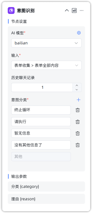 根据表单收集到的内容,对补充信息进行意图识别,判断用户是继续补充信息,还是终止循环希望给出规划总结。其中,当判断为“其他”时,将把已知信息进行赋值,并继续循环;其他条件则走入 Break 结点。
