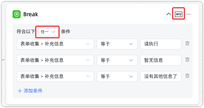 当判断到用户没有补充信息后,跳出循环,进行规划总结。注意需要把判断条件和执行条件都设置为“任一”。