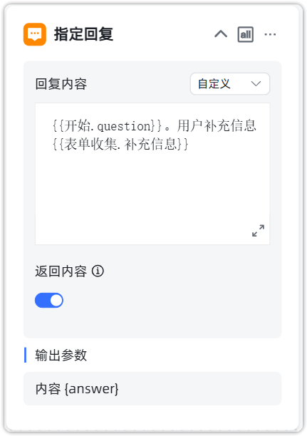 将用户的问题与表单收集到的补充的信息用指定回复整合到一起。