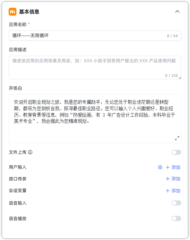 在我们的职业规划小助手需求中,我们应该使用“无限循环”,最后通过意图判别终止循环操作。所以在这里我们设置“无限循环”。