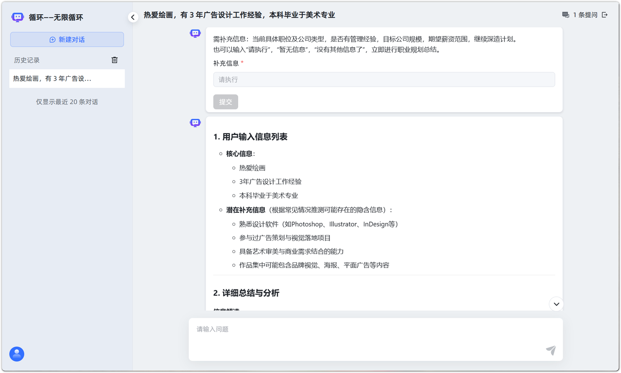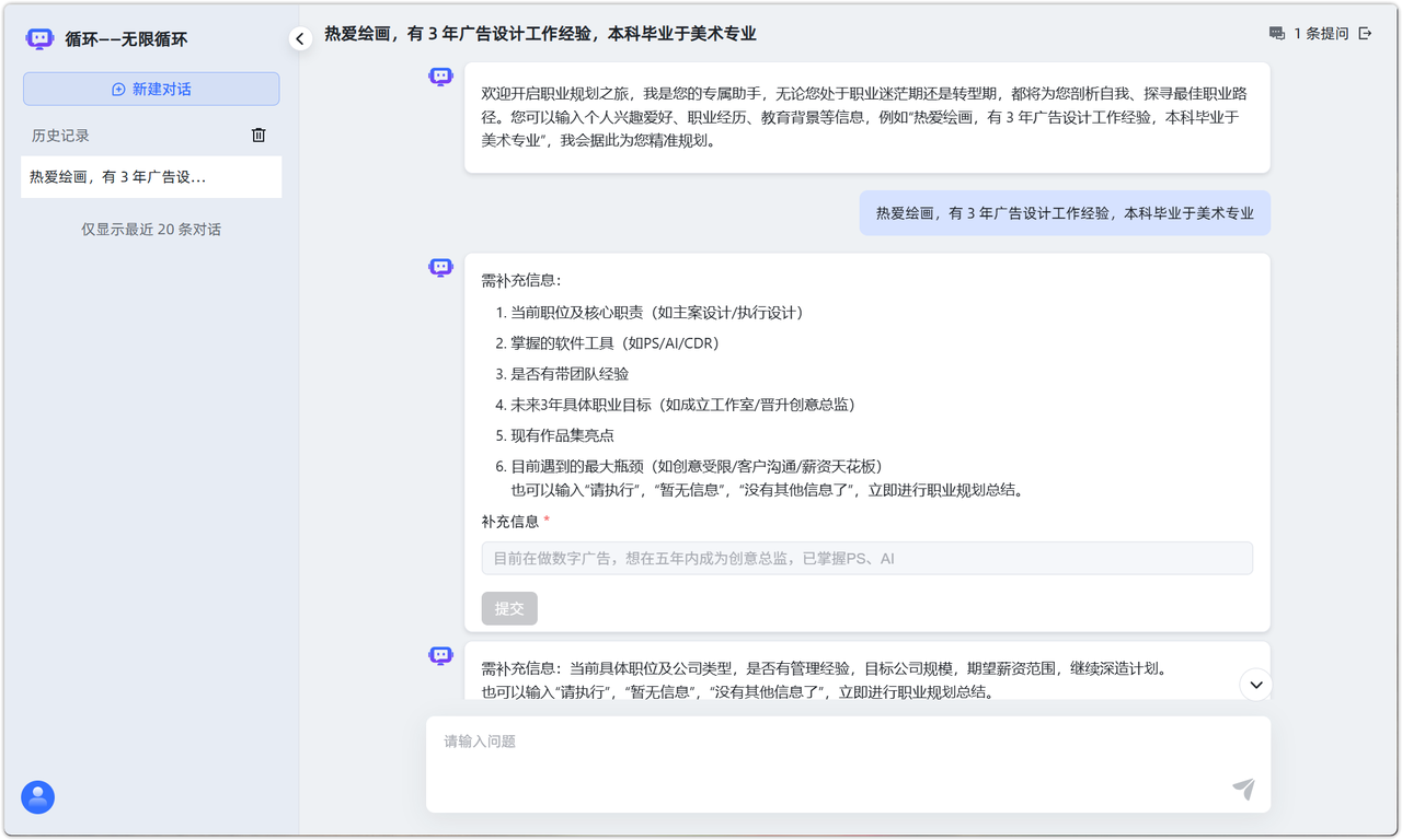 应用场景:通过持续与用户对话,动态补充职业信息,直到用户确认信息完整后生成职业规划总结。