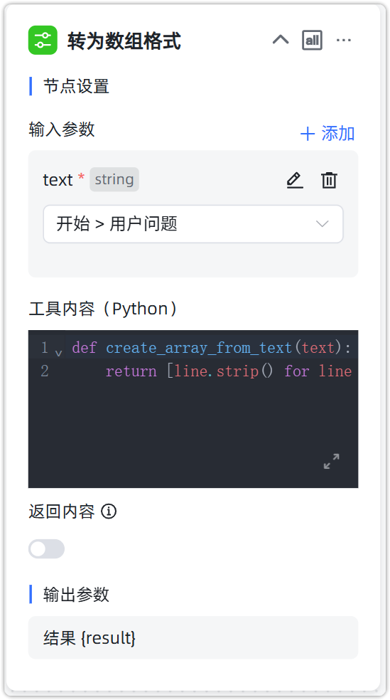 添加自定义工具,添加输入参数,函数内容为转换用户输入的多个问题为数组格式。