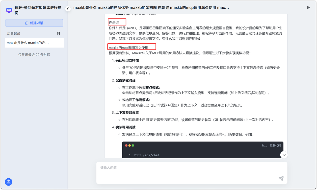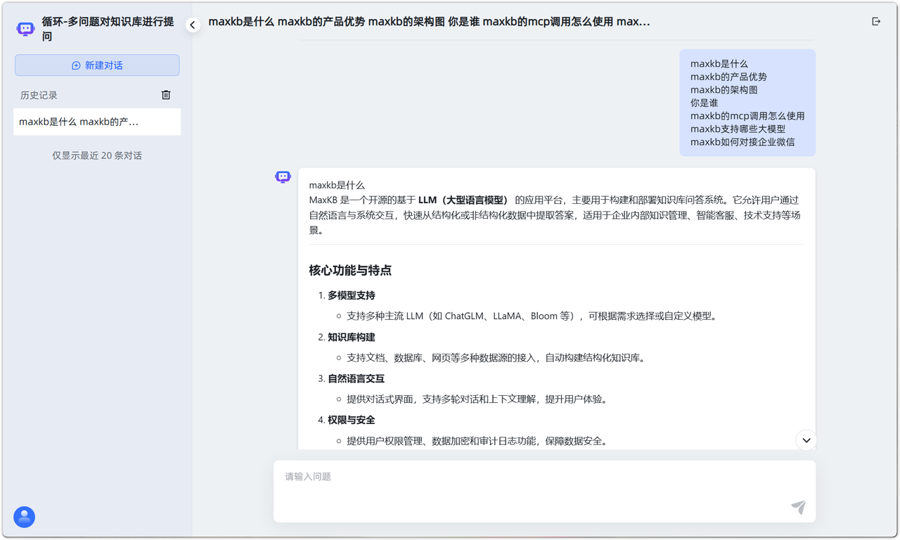 回答的结果能将每个问题单独通过循环体进行检索和回答,极大减少了因问题输入过多产生的向量检索准确度降低的问题。同时,AI 对话也不会超过模型的最大 Tokens。