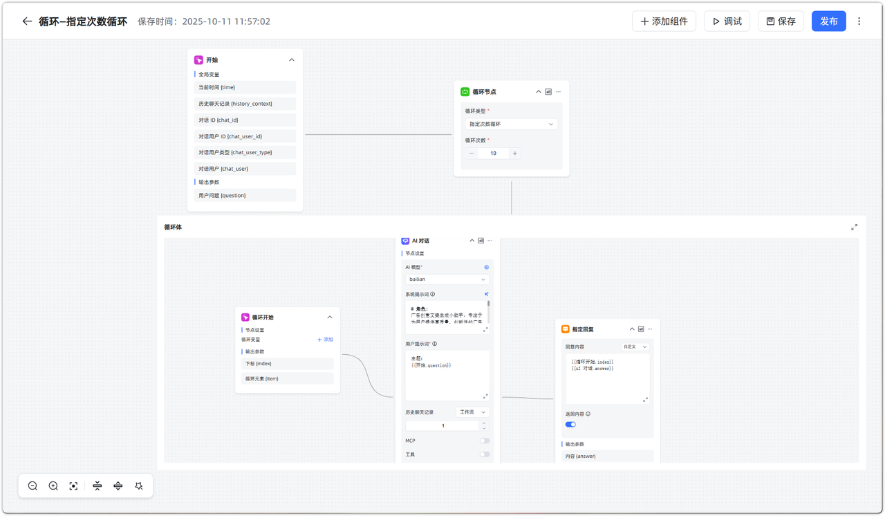 设置循环节点的循环类型为“指定次数循环”,设置循环次数为 10 次,通过循环实现指定次数广告创意生成。