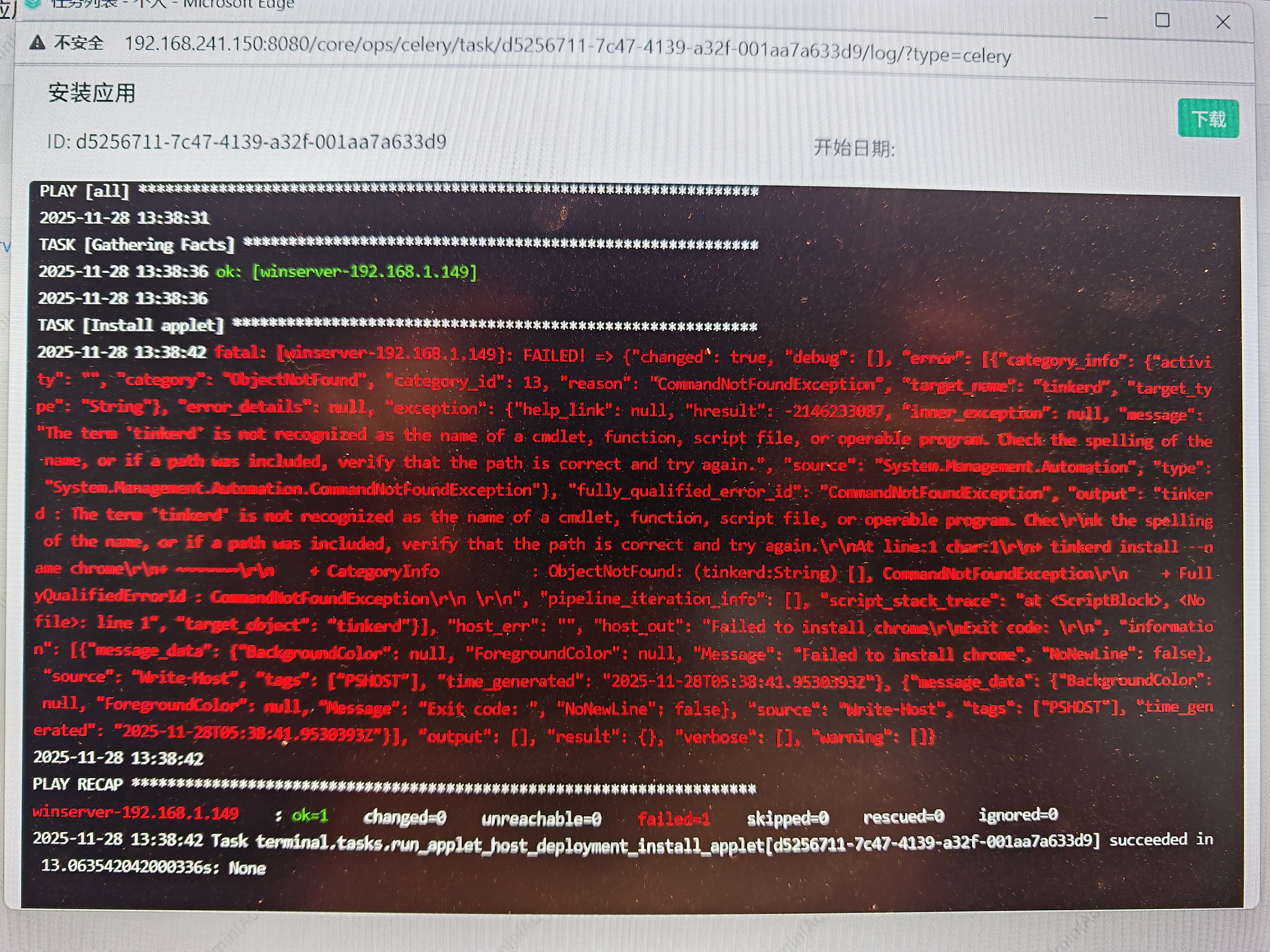 tinkerd的程序、脚本或内部命令, 问题出在没有初始化部署发布机 - 后续在部署发布机时遇到报错 , fatal: [winserver-192.168.1.149]: FAILED! => {"changed": false, "elapsed": 21.0506745, "msg": "Unhandled exception occurred when sending web request. Exception: Unable to connect to the remote server", "status_code": null, "url": "http://192.168.241.150"}, 检查了发布机与堡垒机的网络, 需要打开相关端口后使二者可互相通信, 修改后问题解决。