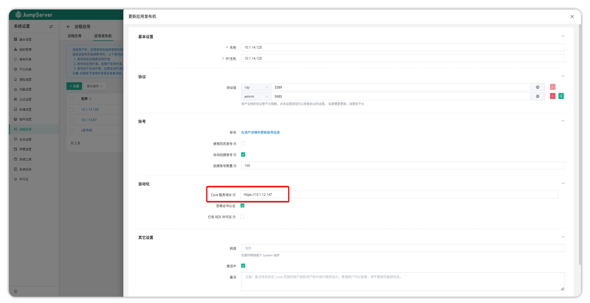 配置发布机 Core 服务地址为 JumpServer 访问地址。如下图所示。