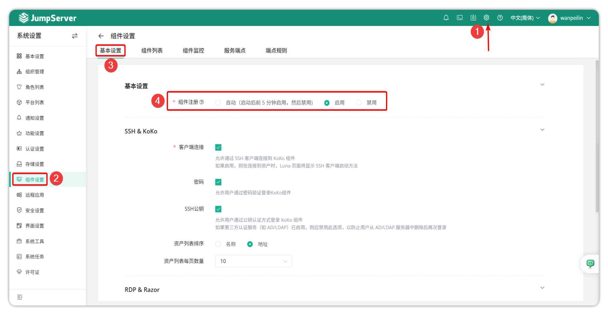 开启终端注册功能。在 JumpServer V4版本中,该操作位置位于:系统设置→组件设置→基本注册→组件注册。