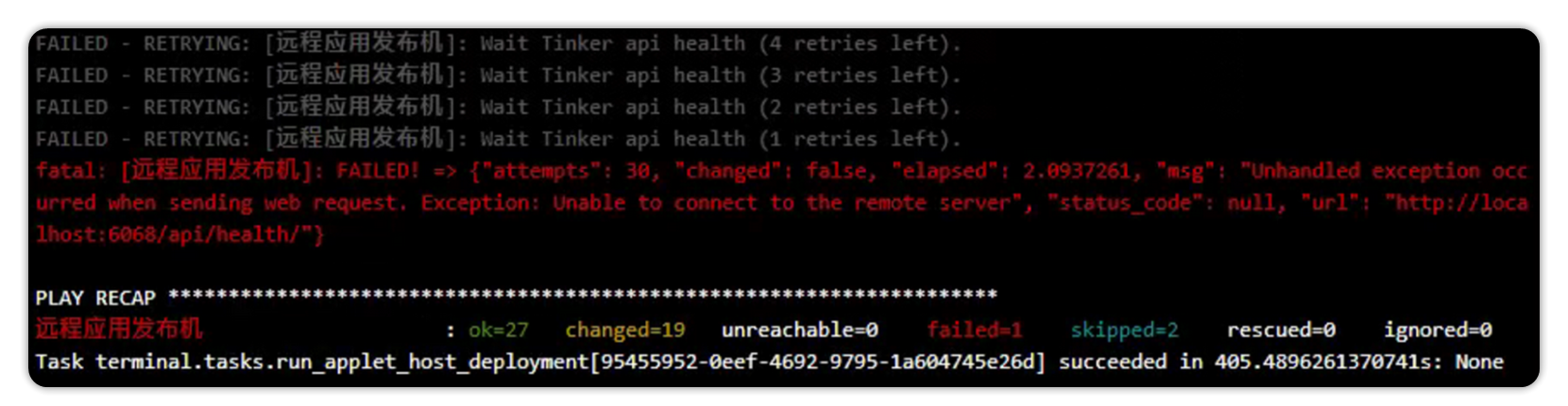 JumpServer 部署远程应用发布机时,自动化部署任务停留在 ”Wait Tinker api health“ 阶段,异常信息如下: