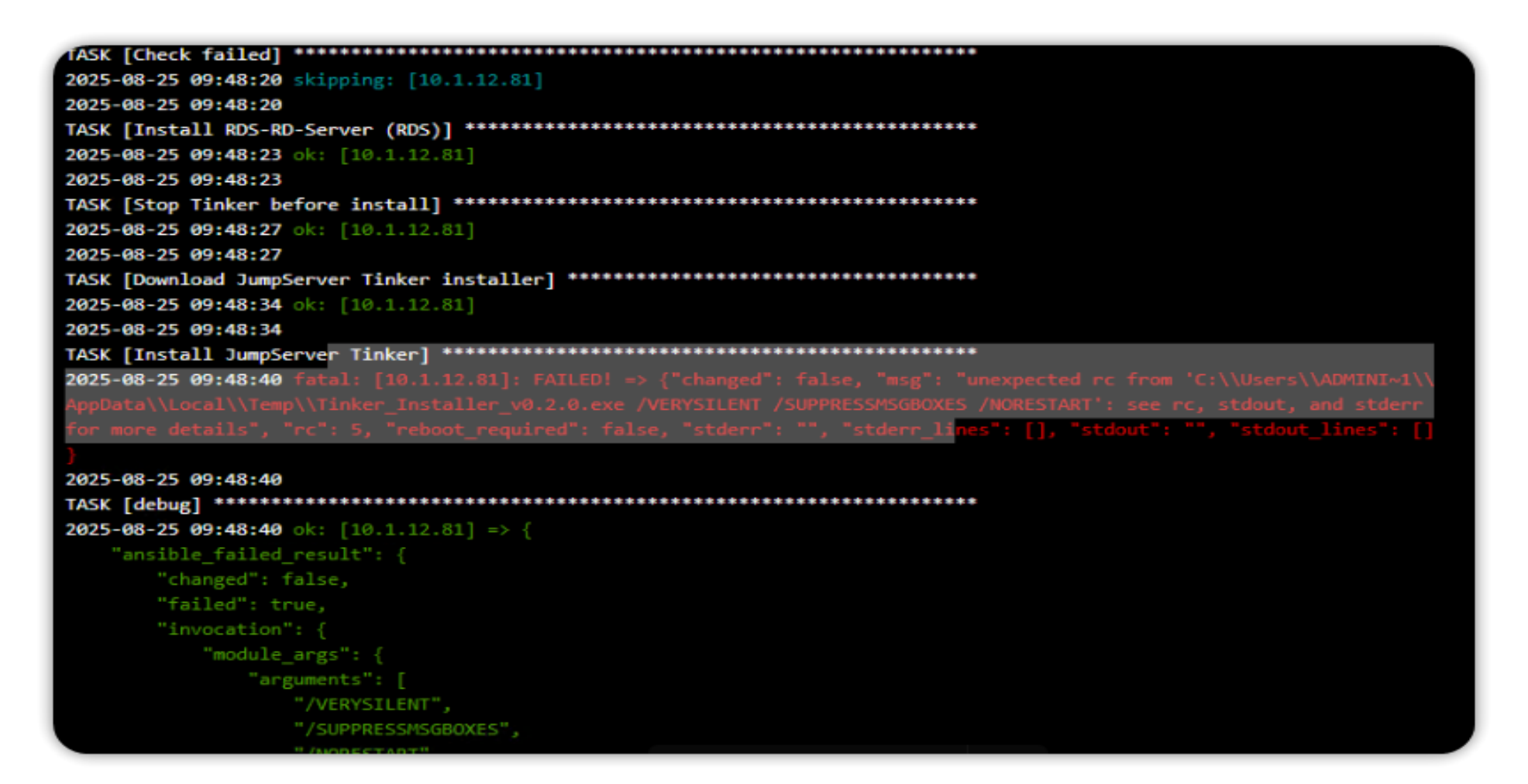 出现“rc:5的报错信息”, 通常是由于权限不足导致, Tinker 组件可以通过堡垒机初始化部署下载到发布机中, 但是不能执行安装操作。