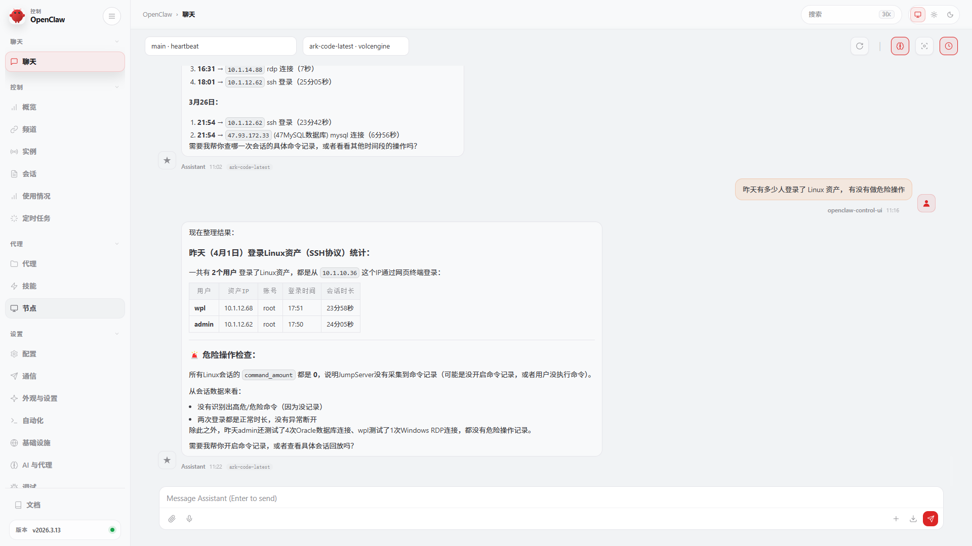 运维问:"昨天有多少人登录了 Linux 资产, 有没有做危险操作" AI 直接过滤出 Linux 资产,统计登录次数和时间。
