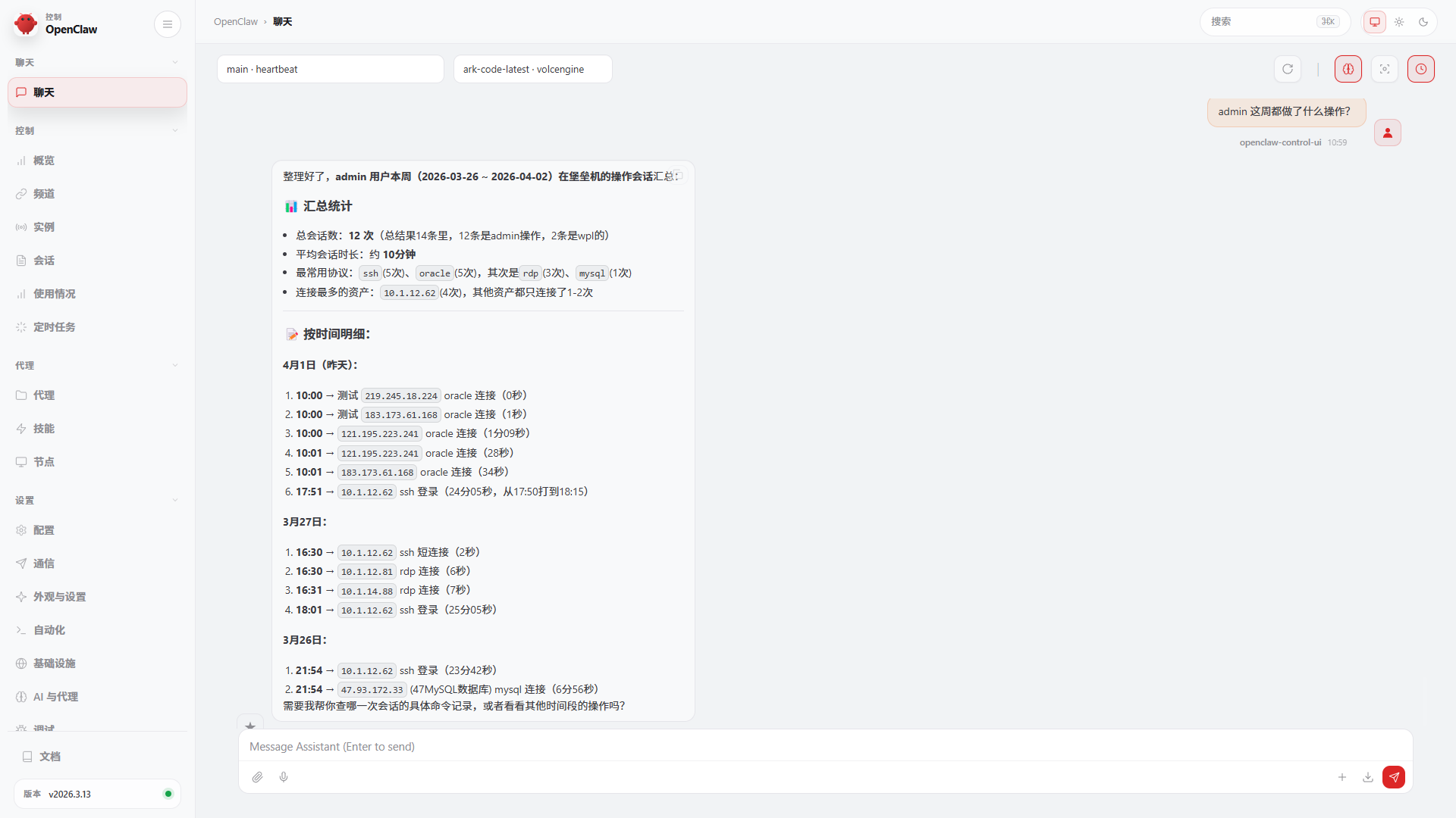 审计问:"admin 这周都做了什么操作?" AI 按天汇总,哪天登录了,哪天改了配置,一清二楚。