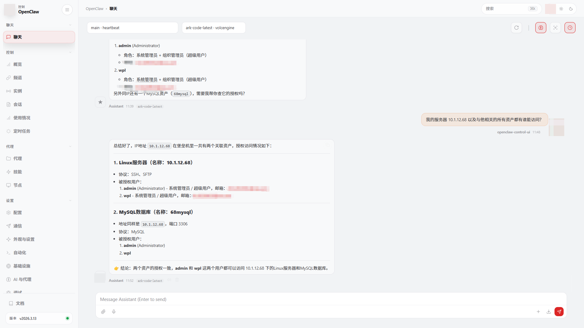 - 用户问:"我的服务器 10.1.12.68 都有谁能访问?" AI 直接查出相关服务器资产以及授权信息,快速出结果