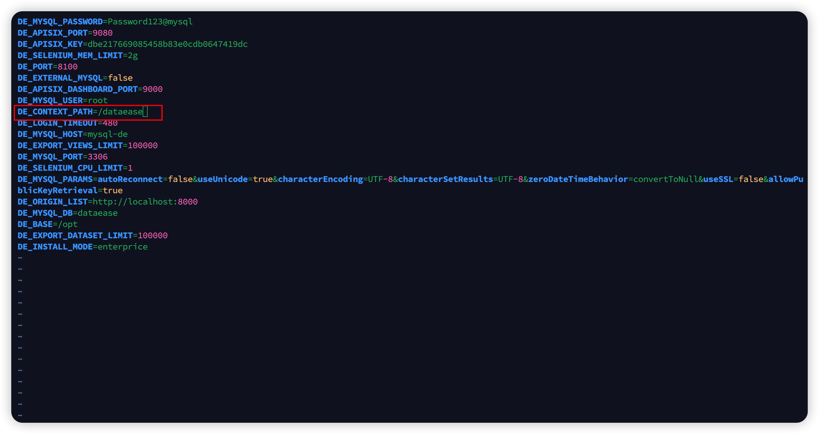 2)修改安装目录(安装目录默认路径为 /opt/dataease2.0/)下的 .env 文件,添加配置项:DE_CONTEXT_PATH=/dataease