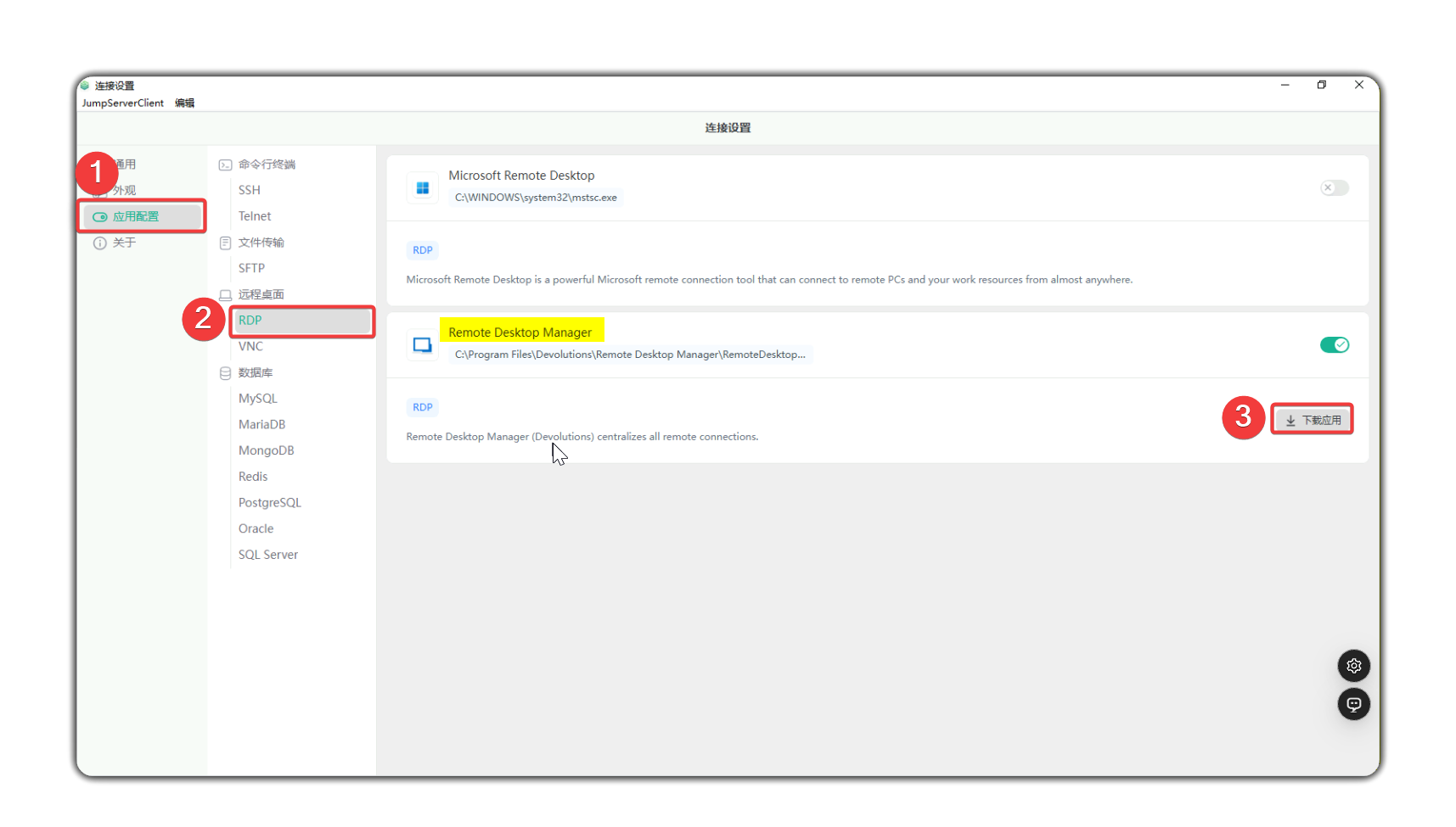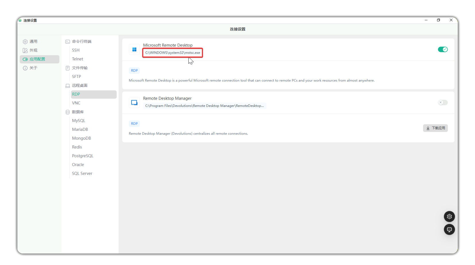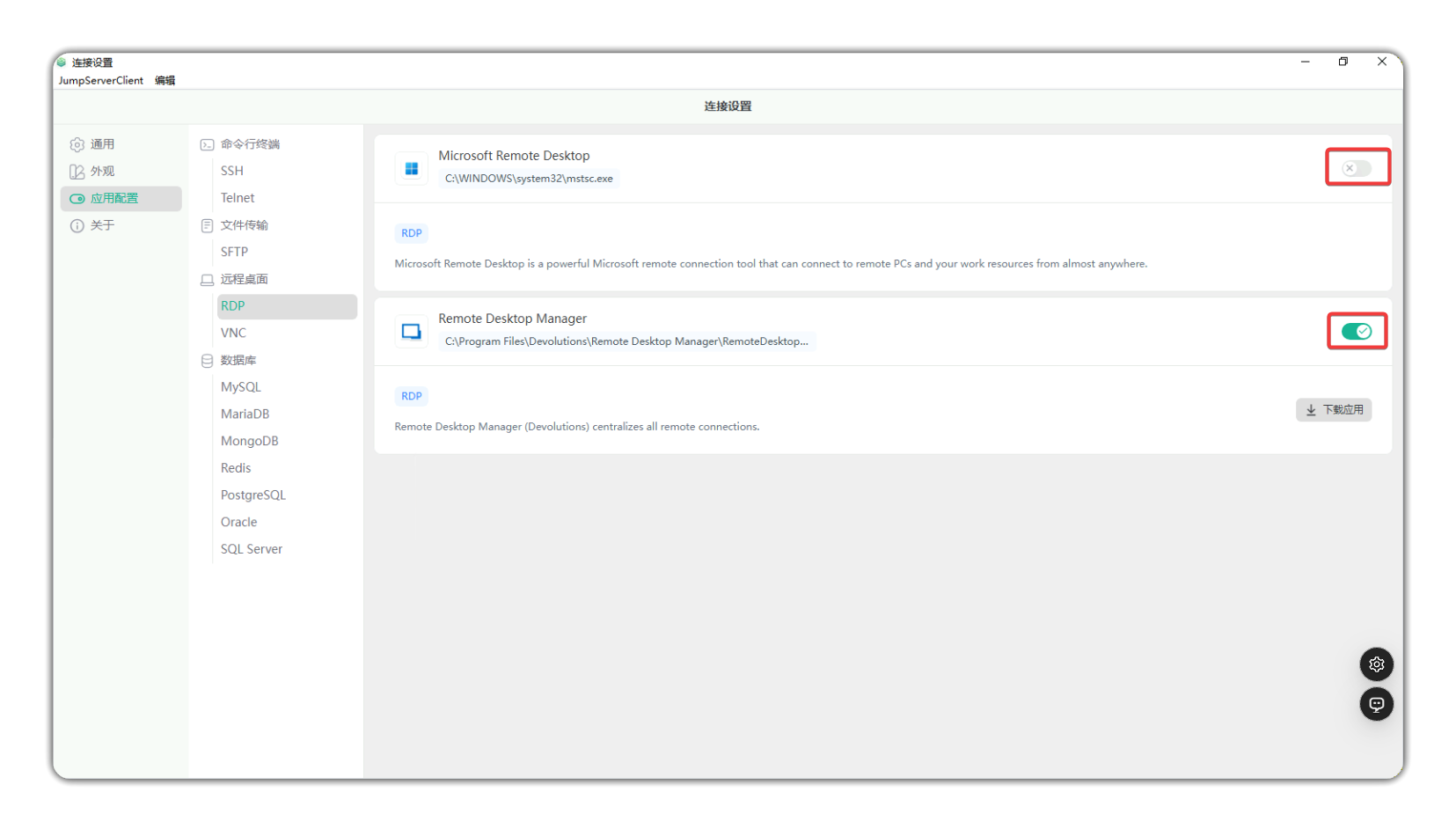在客户端右上角点击“齿轮”图标设置后弹出连接设置窗口,点击左侧菜单栏的应用配置后跳出协议选择界面,点击远程桌面模块的 RDP,以 Remote Desktop Manager 为例,点击“下载应用”,即可进入浏览器进行下载流程。