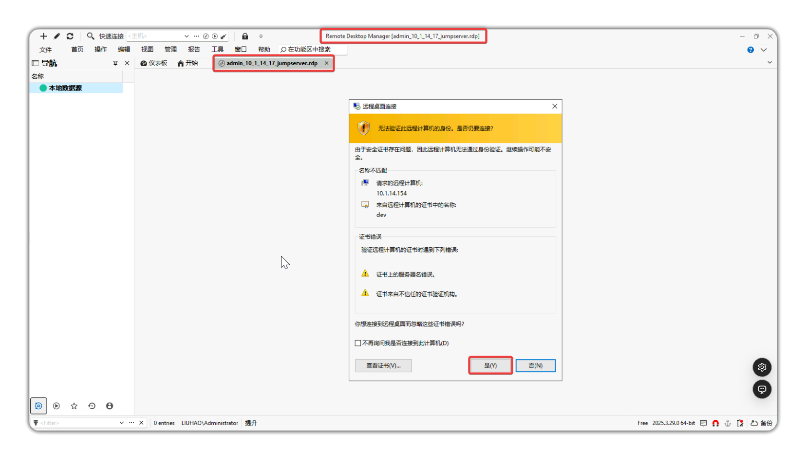 打开客户端之后,对相应的 Windows 资产进行连接,点击”连接“按钮,客户端会自动拉起刚刚配置好的连接方式(Remote Desktop Manager),并自动打开连接提示,手动允许后即可连接远程桌面服务。