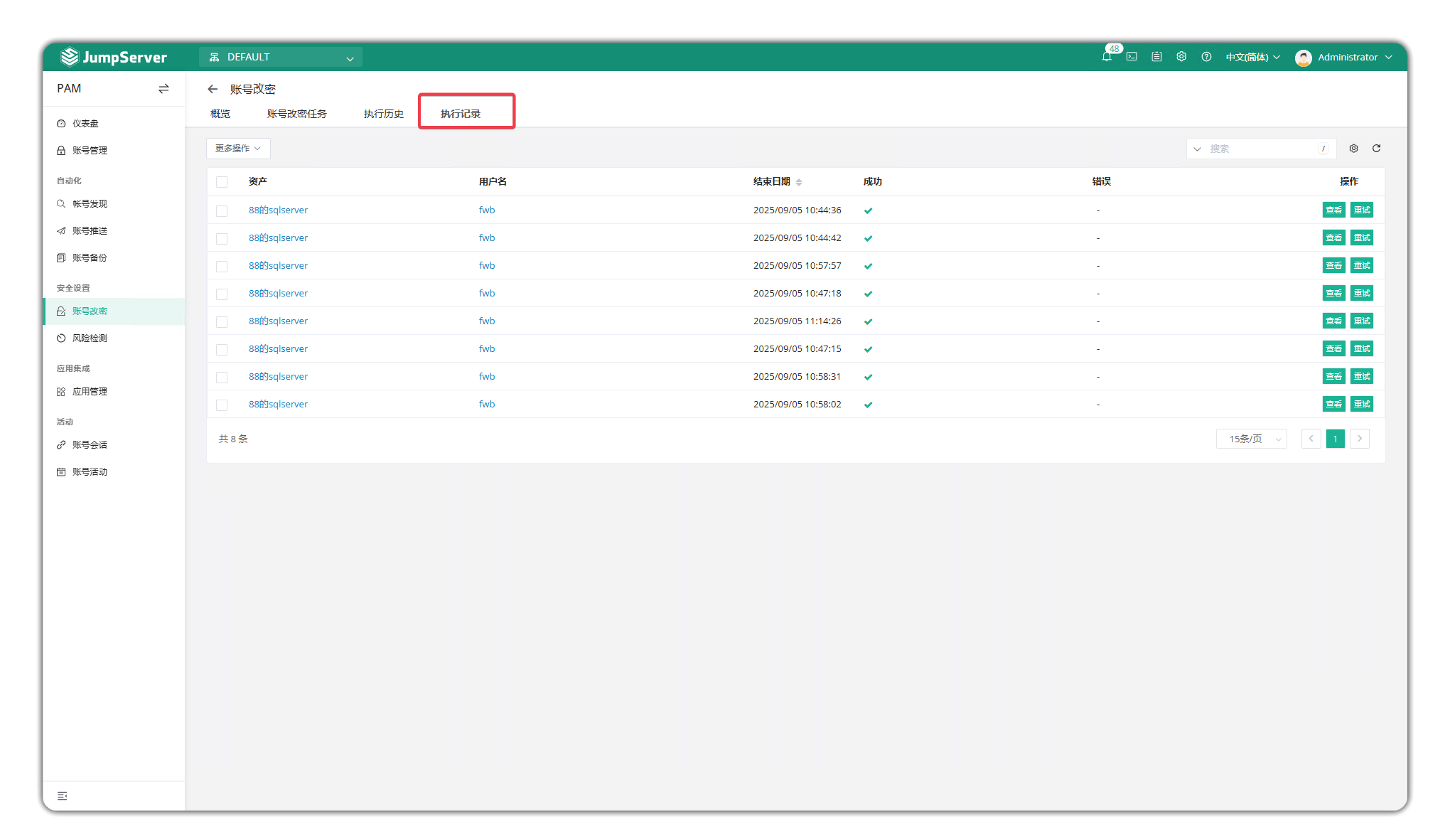 执行记录页面主要显示已更改密码的每个账号的记录,您可以查看新旧密码并更改账号密码。查看新旧密码需要用户进行 MFA 验证。