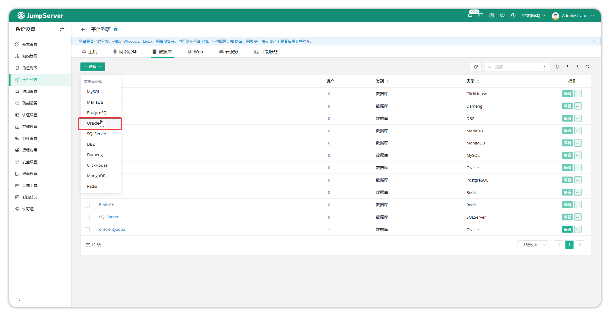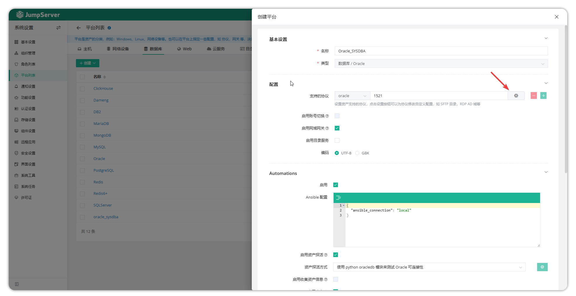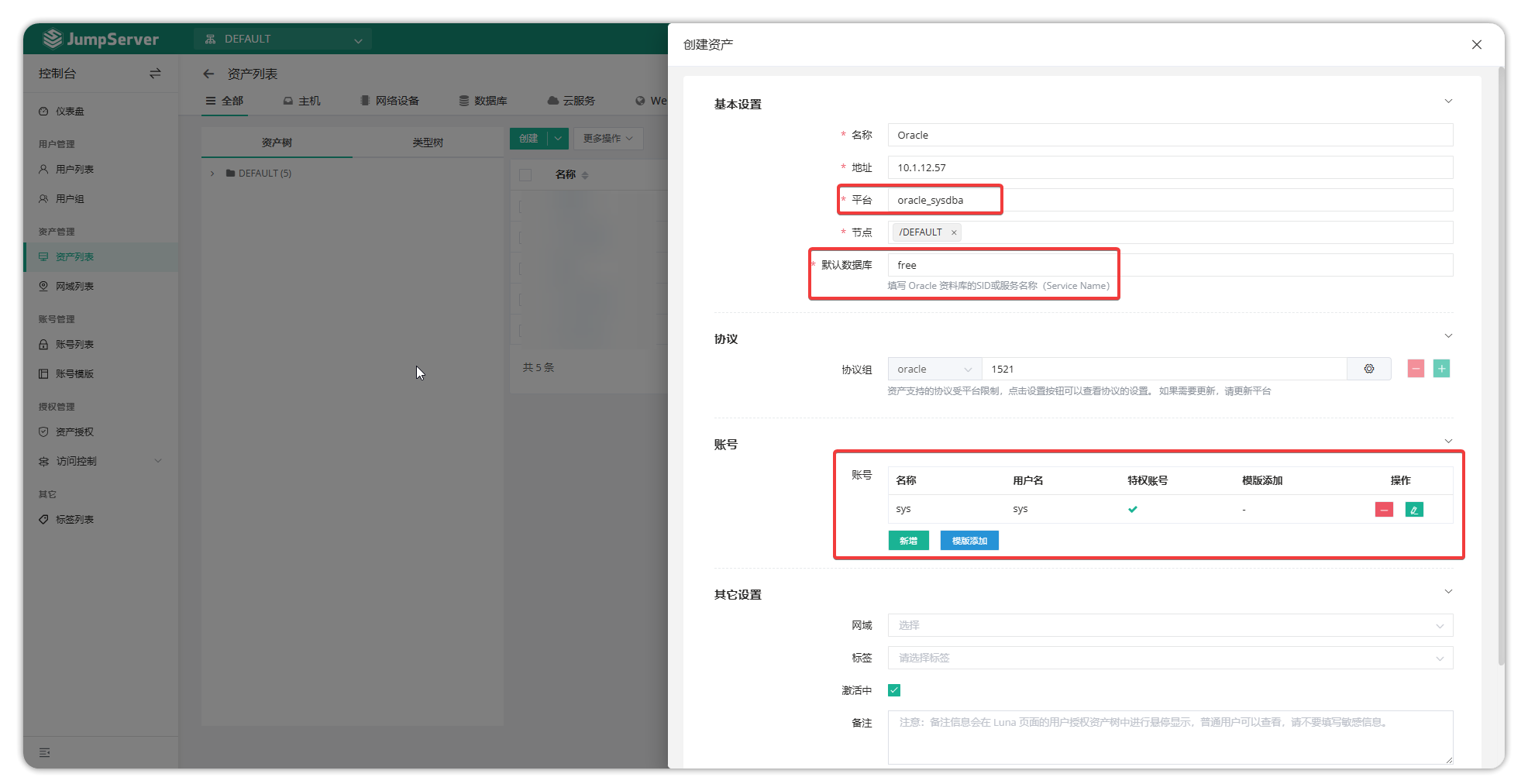 创建完成后,前往控制台创建 Oracle 资产,选择为刚才创建的平台,添加使用的特权账户 sys 即完成纳管。