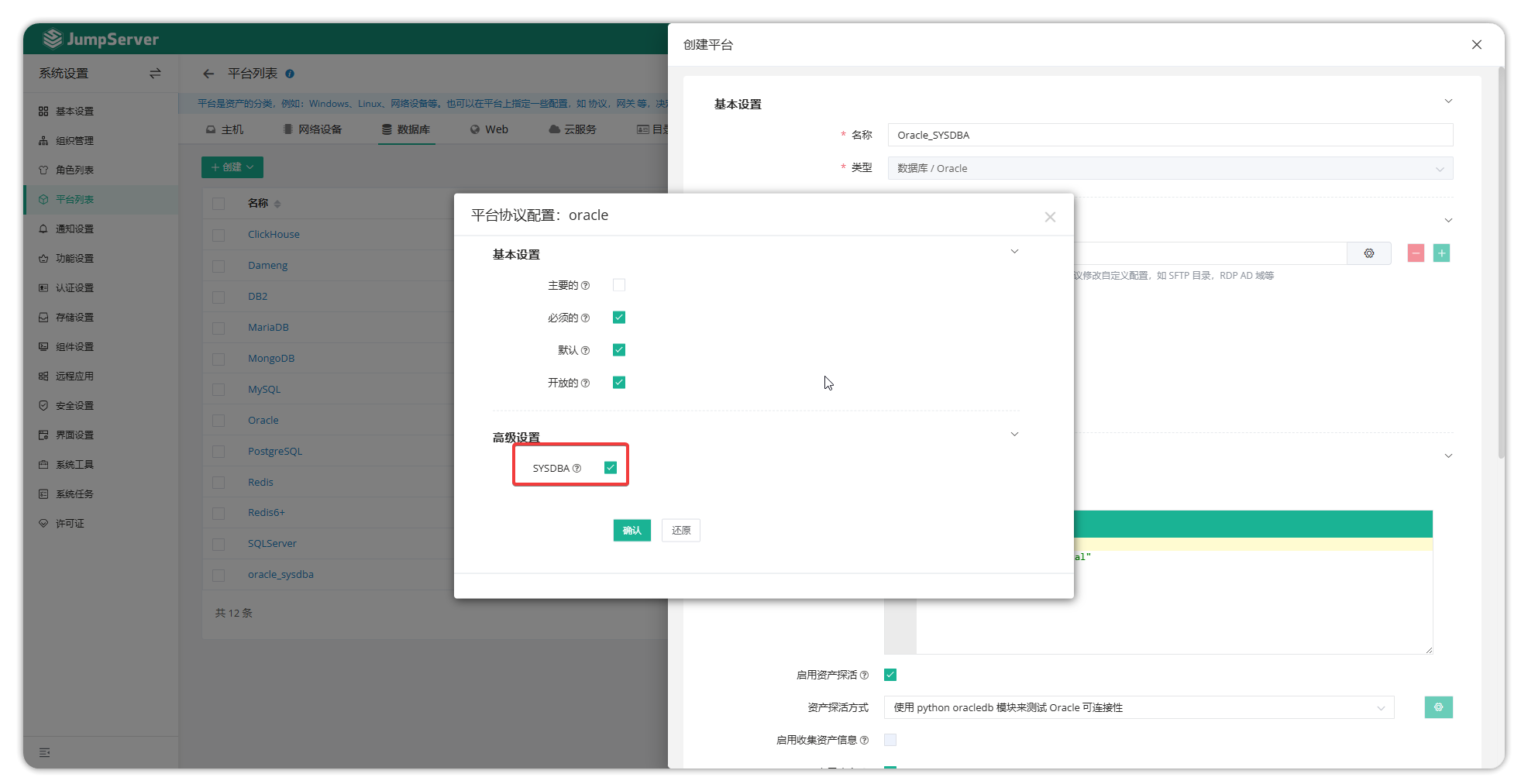 JumpServer默认创建了一个 Oracle 平台,但该平台的协议设置未开启SYSDBA身份用户登录,若使用SYSDBA身份用户,需要克隆一个 Oracle 平台,协议设置中启用该选项。