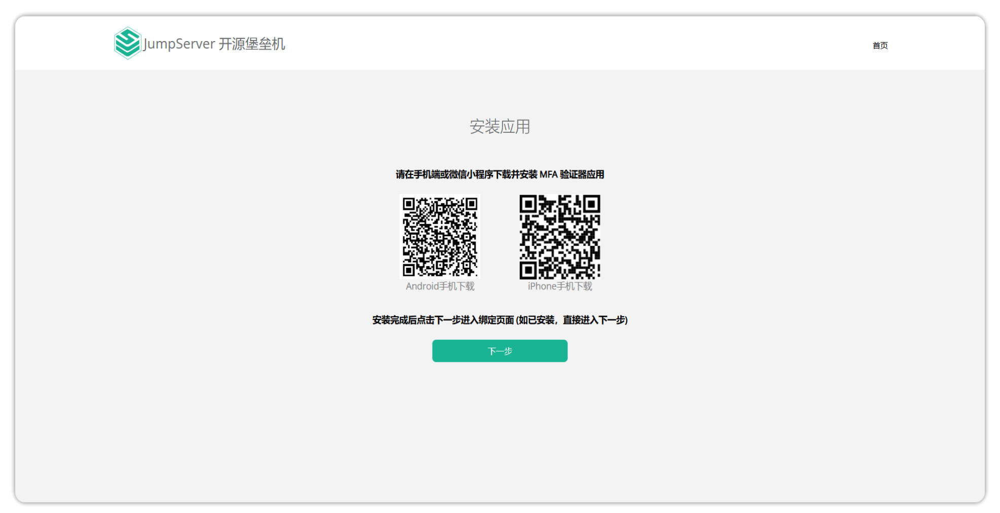 点击“下一步”进入 MFA 工具下载页面,堡垒机内嵌的二维码下载的 MFA 工具为google authenticator。如果需要下载,可使用浏览器扫一扫进入下载页面并安装,也可选用其他 MFA 工具。