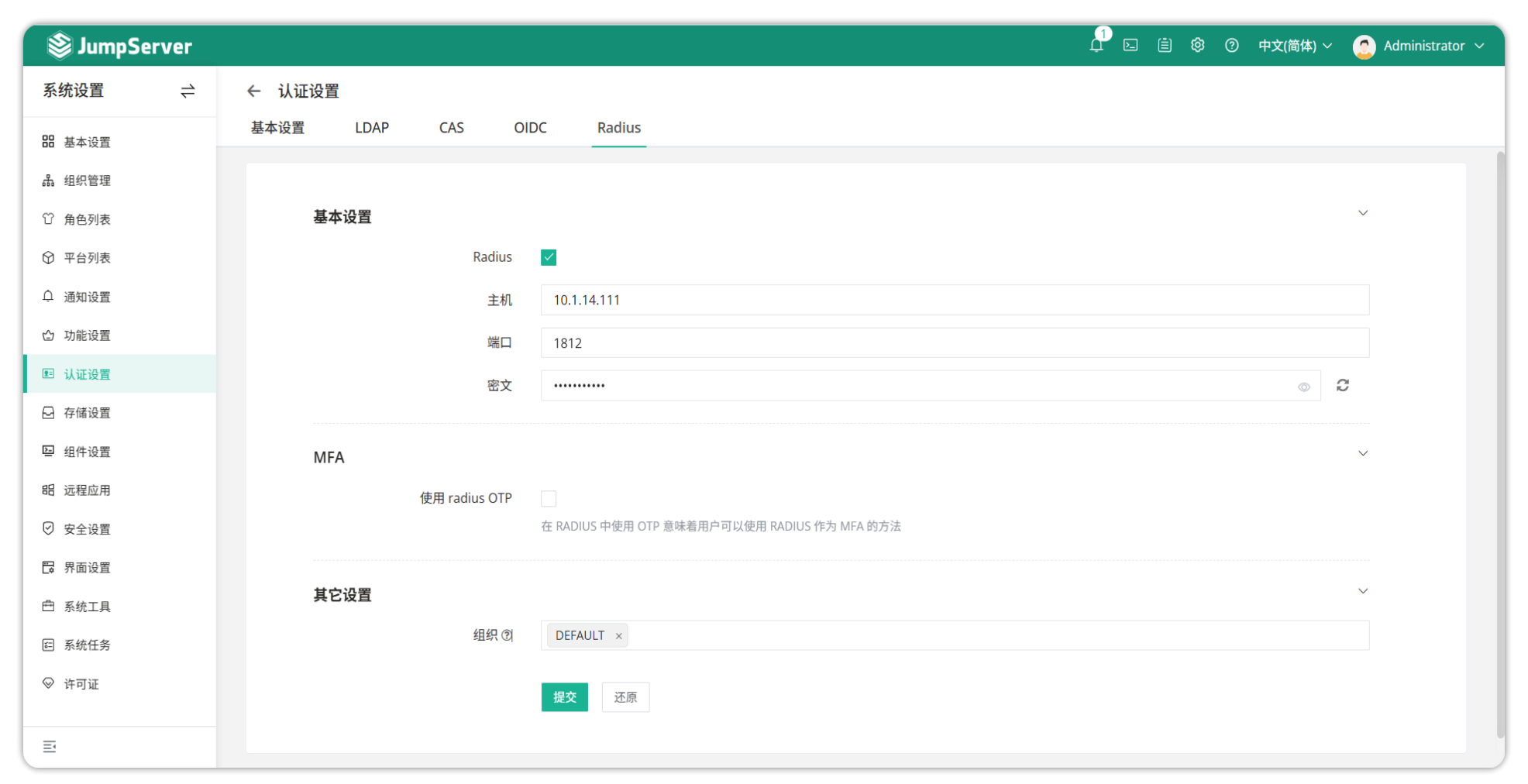 JumpServer 支持使用 Radius 进行认证。Radius 认证可直接在页面进行配置,具体配置如下图所示: