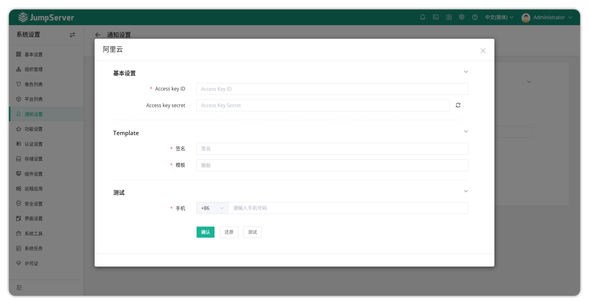 选择对应的短信服务商,以阿里云为例。填入阿里云短信服务的相关信息,点击<测试>按钮可测试配置是否正确。